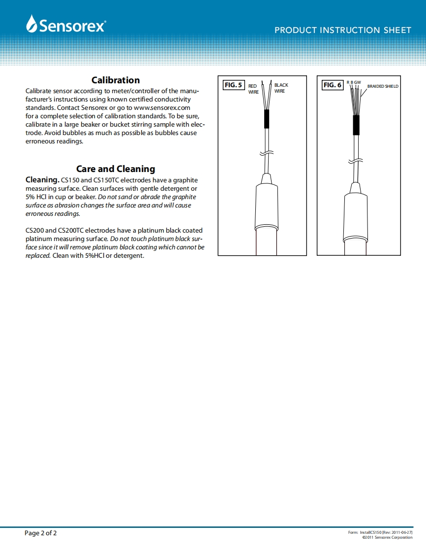 SensorexPRODUCT INSTRUCTION SHEETEpoxy Body Conductivity Sensors -Graphite and Platinum BlackProduct InstructionsMechanical InstallationSubmersion Installation.The CS150 or CS200 electrodecan be submersed and mounted in a tank for conductivity mea-FIG.1FIG.21/2 or 3/4 NPT COUPLERsurement using gland and nut fitting FC50P(1/2"NPT)or FC75P(3/4"NPT).The FC50P or FC75 must first be inverted so the nutis pointed downwards.Loosen the nut by turning clockwise(remember that fitting is inverted).Slip electrode through holein nut until desired depth is reached.Tighten nut (hand-tight)by turning counterclockwise.Refer to FIG 1 and FIG 2.In-Line Installation.Mounting in-line is also possible usingFC50P or FC75P fittings.For in-line mounting it is suggestedSENSORthat the sensor be mounted through the side of the tee asshown in FIG 3 and FIG 4.The sensor must also be mounted such that the opening/slot inthe body is pointed upward so as to allow any air bubbles to riseout of the sensor and escape with the flow.Electrode Removal.Simply reverse installation proceduresabove.REMEMBER TO USEElectrical InstallationTEFLON TAPE TO SEALALL THREADEDInstallation for Electrodes without TemperatureCONNECTIONS!Sensor Incuded:The CS150 or CS200 does not includetemperature sensors.Each is supplied with two connections(red and black)and optional ground.Refer to FIG 5.These wiresFIG.3are for conductivity connection and have no unique polarity.Connect to any conductivity controller or transmitter per themanufacturer's wiring instructions at the connections marked"conductivity"or "cell".FLOWInstallation for Electrodes with TemperatureSensor Incuded:Electrodes with part number CS150TC-_or CS200TC-include a temperature sensor to provide a tem-perature signal so that your conductivity instrument can per-form temperature compensation(correct conductivity value to25C or 20C depending on instrument manufacturer).The tem-FIG.4perature wires are green and white.See FIG 6 for wiring details.These temperature wires can be connected to the instrument'stemperature input in any order since the ouput is a resistancesignal(Ohms).Please note that some meters require a three orfour wire temperature signal input.In these cases,place a jump-FLOWer wire(for three-wire type)or two jumper wires(for four-wireDIRECTIONtype)from the original lead to open temperature inputs.Pleaserefer to manufacturer's manual for details.Parts covered by this product data sheet include:CS150,CS150TC,CS200,CS200TCPage 1 of2Form:InstallCS150 [Rev:2011-06-27]2011 Sensorex Corporstion