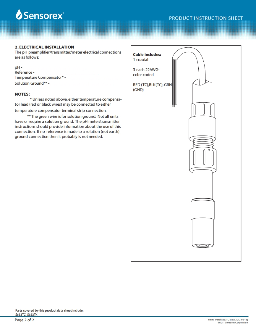 SensorexPRODUCT INSTRUCTION SHEETSubmersible Cap and Cable With TemperatureCompensation S653TC/S653TKProduct InstructionsMechanical Installation1G.1CONDUIT CONNECTION.The Temperature CompensatedSubmersible Cable Assembly is supplied with a 1/2"male pipethread.Attach to this thread a coupling or reducing bushingand the required length of support pipe.1/2"NPT Couplerand PVC PipeELECTRODE INSTALLATION.The electrode mounts in thecable cap by a 1/4 turn which locks together the mating BNC-type connectors.Refer to Figure 2.It is important that theelectrode be locked in position and the following stepwiseprocedure is suggested:A.While pushing the electrode into the cap,rotate itclockwise until it slips into the notch of the mating connector.This step requires no real amount of force and,when complet-Use Pipe Threaded,the cap will cover most of the electrode's top O-ring.Sealing TapeB.Now,without further rotation,push the electrodeto seal threadsinto the cap until the bottom O-ring is mostly covered and theblack washer almost touches the cable cap.C.Finally,again rotate the electrode clockwise untilit "clicks"into the locking position(about V turn).Now thebottom O-ring will be fully covered and the bottom of the capwill rest firmly against the electrode's black washer.F1G.2ELECTRODE REMOVAL.Simply reverse installtion proce-dure.IMPORTANT NOTES:1)As supplied the electrode's O-ringshave a light coating of silicone grease.After several insertionsand removals,it may be necessary to re-lubricate the O-rings.A stopcock or vacuum-type silicone grease should be used.2)DO NOT IMMERSE CAP AND CABLE ASSEMBLY INTO SOLU-TION WITHOUT ELECTRODE ATTACHED!!!Push upCAUTION:MAKE SURE ELECTRODE ISafterGrease o-ringsaligningwith siliconeORIENTED AS SHOWN IN FIG 2.WHENgrease be foretabsinstallationINSTALLING OR REMOVING SO THATLIQUID CANNOT FLOW BACKINTO THEINTERNAL CONNECTOR!1/4 TURNParts covered by this product data sheet include:S653TC,S653TKPage 1 of 2Form:InstallS653TC [Rev:2012-05-16]2011 Sensorex Corportion
