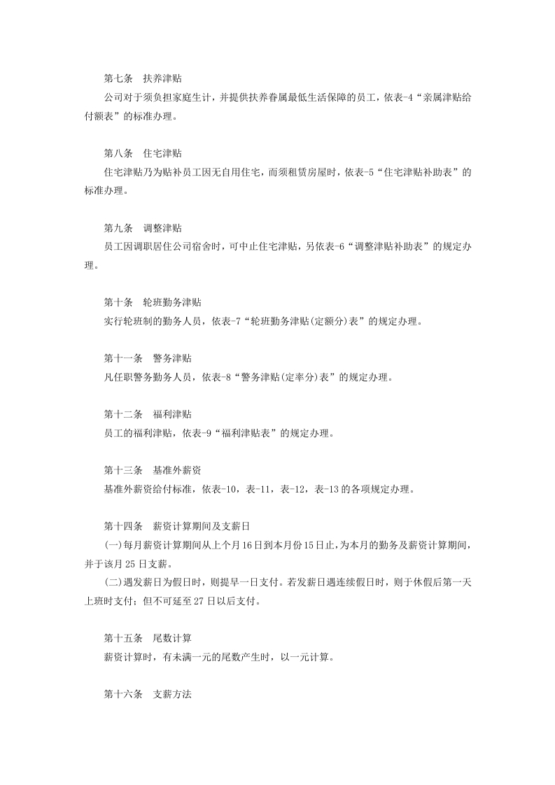 机械制造业薪资制度一、总则第一条目的本规则是依据人事管理规章的规定,对于员工薪资、奖金、津贴等事项制定。第二条薪资给付原则薪资在给付原则上,应与公司委派的工作成正比。因此,非规定的休假及非公司委派的勤务,不支付薪资。二、薪资的分类、给付第三条薪资的分类薪资包括两大部分:(一)基准内薪资(二)基准外薪资1.提早上班、加班津贴:2.深夜津贴:3.假日加班津贴:4.轮班制勤务津贴:5.休假日勤务津贴:6.警务津贴(比例分):7.值班津贴:8.通宵津贴:9.调驻津贴:10.交通津贴:11.春节加班津贴:12.临时传呼津贴。第四条缺勤扣除基本额员工缺勤时,依基准内薪资×1176×缺勤时数,为缺勤扣除基本额。第五条本薪本薪金给付原则,包括下列四项:(一)本薪依员工的职务及执行能力决定。(二)本薪包括基本薪资及年资两种。(三)新进员工的薪资计算方式,依表-1“初任基准薪资表”的标准给付。(四)服务满一年以上的员工,依表-2“员工年龄最低薪资表”的标准给付。第六条职等津贴经公司试用期满的员工,由人事科评定员工的职等,依表-3“职等津贴表”的标准给付。