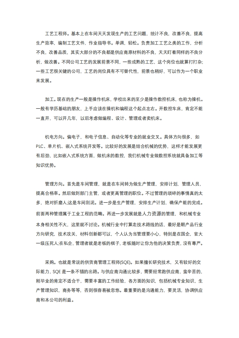 机械专业大学生职业生涯规戏划范文机械专业的出路很宽,正是因为太多的选择在我们面前,导致很多朋友在选择工作的时候迷茫,甚至工作后发展仍然迷茫。本文的目的是尝试列出机械专业不同的出路,以便我们在选择出路时,有一个比较清醒的选择思路。读者对象是在校学生以及毕业工作5年以内的朋友。见过很多有着相当机械天赋的人整天做着低层次没有创造力的工作:也见过很多资质一般,但因为把握住某些机会生活的很滋润的人。个人觉得对于毕业生来说,第一份工作是很重要的:对于工作中的朋友,明确自己的定位也很重要。建议你骑驴找马的去工作,那是对你的时间、机会、自信和舞台的不负责。出于各自的位置,很多人还是会告诉你先就业,后择业。下面列出一些常见的岗位:设计工程师。模具、汽车、家电、工程机械、非标准设备等等各种机械设备的设计。用着常用的机械设计软件(延伸阅读:《常用机械设计软件大全》)Auto CAD、Proe、UG等工具做产品结构设计或其他设计,不断的修改,天天对着电脑,有空还会网上到处转转,做设计需要很好的耐心。设计新人不少会热衷折腾设计软件的各种技巧,这是一个误区:设计软件和机械产品设计的关系就如同书法和文学作品的关系,好的书法能写出好看的字,但不一定能写出好的文学作品。因此做好设计的关键在于设计素养的积累,而不是软件本身,所以没必要为了满足某些目的,学上一堆软件,而忽略机械设计的本质。设计的职业生涯很长,但成为一个优秀的设计师,需要学习的东西也很多,材料、工艺、加工、美学等等。设备工程师。就是在生产车间做设备维护,天天和设备打交道,设备坏了就修:没坏就保养。需要熟悉所管理设备的原理,以及设备相关的知识。是一个没事比较清闲,有事就得辛苦的岗位。设备管理的出路可以转做设计类职位,也可以做设备的技术支持或者销售。