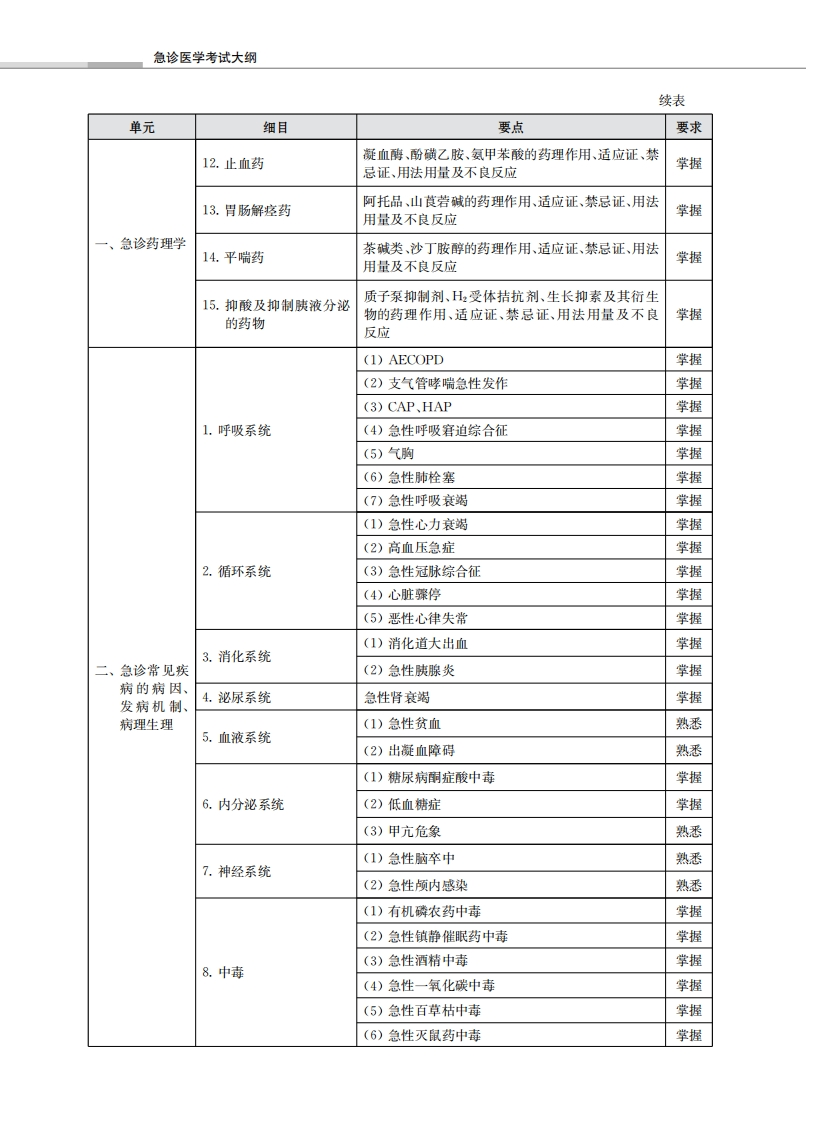 急诊医学考试大纲基础知识单元细目要点要求吗啡、芬太尼及衍生物、氟比洛芬酯、丙泊酚、苯二氨1.镇痛镇静药掌握草类药物的药理作用、适应证、禁忌证及用法用量肾上腺素、去甲肾上腺素、多巴胺及异丙基肾上腺素2.血管活性药物掌握的药理作用、适应证及用法用量硝普钠、硝酸甘油、尼卡地平及乌拉地尔的药理作3.高血压急症用药用、适应证、禁忌证、用法用量、不良反应及注意掌握事项利多卡因、艾司洛尔、胺碘酮及地尔硫草的药理作4.抗恶性心律失常药物用、适应证、禁忌证、用法用量、不良反应及注意掌握事项尿激酶、阿替普酶的药理作用、适应证、禁忌证、用法5.急诊溶栓药掌握用量及不良反应(1)阿司匹林、氯吡格雷的药理作用、适应证、禁忌学握证、用法用量及不良反应6.急诊抗栓药一、急诊药理学(2)肝素、低分子肝素、磺达肝癸钠、华法林的药理掌握作用、适应证、禁忌证、用法用量及不良反应7.急诊抗心肌缺血药硝酸酯类药物的药理作用、适应证、禁忌证、用法用掌握量及不良反应去乙酰毛花苷、多巴酚丁胺、米力农、左西孟旦的药8.正性肌力药物学握理作用、适应证、用法用量、不良反应及注意事项青霉素类、头孢菌素类、碳青霉烯类、喹诺酮类、氨基9.急诊常用抗微生物药糖苷类、大环内酯类、糖肽类及奥司他韦的药理作掌握物用、临床应用及不良反应(1)有机磷中毒解毒药:氯解磷定、碘解磷定的药理作用、临床应用及不良反应;抗胆碱能药物阿托掌握10.急诊常用解毒药物品、长托宁的药理作用、临床应用及注意事项(2)中枢神经抑制剂解毒药:氟马西尼、纳洛酮的临掌握床应用及注意事项甘露醇、甘油果糖及速尿的药理作用、适应证、用法11.脱水、利尿剂用量及不良反应掌握