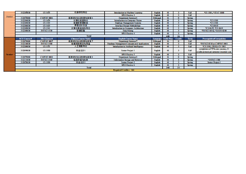 Computer Science Sample Curriculum Schedule-Class 2022SCUCaune日Pit CaunseCredit10421030更法泼8a00910Fdxation-1F:ll913003010大学生业Mentd Health Education3106010CMANF 0001新生形金策如3121600C0I52共文习■31213010EGCVP01a-I班口与乐终1Eng bh Spea里nd Liotaing-l中1631090010ECP0I52A■写作中】1631200500AH0230匠刀日与洁服分■643120000PHYS014物工Pmix Sr Scinceand Engncering IhFEp型31217100CMANF 0010计机心技论6431217004H090中■h441000030中代要3p型900001010]论Mitry Theory1690000030Mitary TranngChinge1200TA00102Hyxical Fdxation-232P中华文化(历史篇/文学首四学制艺木淘ChincseCdureChince401801F3100010CMANF 0002新生时金金美2Frexhmnen Semine 2Biingsd16p里CMPINF 0001312163010NG0Ia0-2■源口语乐力塔2■hca型dt-2163120000AH020折刀石德限升2Andytic (comnctry and Caleu 2Endih644FallsornAH02031300040]PHYS0175物理2工h*Y30143121030s0445数椅Data StructurexhFalllspengCBO CMPINF040131210005TA1000州万■Arcd Sttotcal Mctob■h4Sp里Tatil54SCUComnePit CaurseCHtoe Catne NaneEaghk Coune Nane1m里e0 dit Han CrediPrereaxidteCarequiles10443生率3■The Roic Princplo of MarcomChinge3F80010信3Hyxical Fdxation-332F313020000]CMANF 0003系开策3】Deprtmert Scminae 31631209030LP020阳作3ENGOMP 01523120200AH020折刀狂造极升3Andytic Gcomctry and Caledu 3h4FE里AH230300a030好线性代数论灯ltricexand Lincar由ehf里AH23033U■荷■Docrete Structurex SorMATH U2203121000304H7■干细双与阳Com红O为nictimn ind fosanby里eh■量家B0s045■31219030INFSC 0310信计h*ATH023.CH500]312130STAT 1I餐论ta士n to IobbdityhAH230HSS Flective Ih31042030毛泽车思想形中围特色牡金主义理论体系概论Theory ofSocilom withChingae ChracteriticChinee3p吧104400习近平新时代中国特色社绘主义思想概论An Intoducton u Xi Enpinds Thought on SociliomnChineep电米00010信■Fdxatin-4323107100mCMANF 0004系卧金恐出4Departmert Seminar4SpE里2040A0PHYS0219工物实验32*Y30I43sU9■■贸t士m回3《m3ahhap型ss】3121a030]s10舞大现h3Fall/pringCS0441C04453121030STAT 1152数饮计学导论Itroduaction u Mthemtical StatiticxA115131293]Fsa0510]■数提分折h■3p型hTati91253Pit CauneCltne Coune NaneCreditTera312073000CMHNF 0005爱系时金聚野马年56312I030s12计机的英化流Forml Methods in Co里asx■gh3C30413045312200030]3150作论ntroducton uOperatng Sy cmm3304Z304H9312201030I1I01优化计导论h*MLATH023 *MATH0290312203030]数件工程C30445