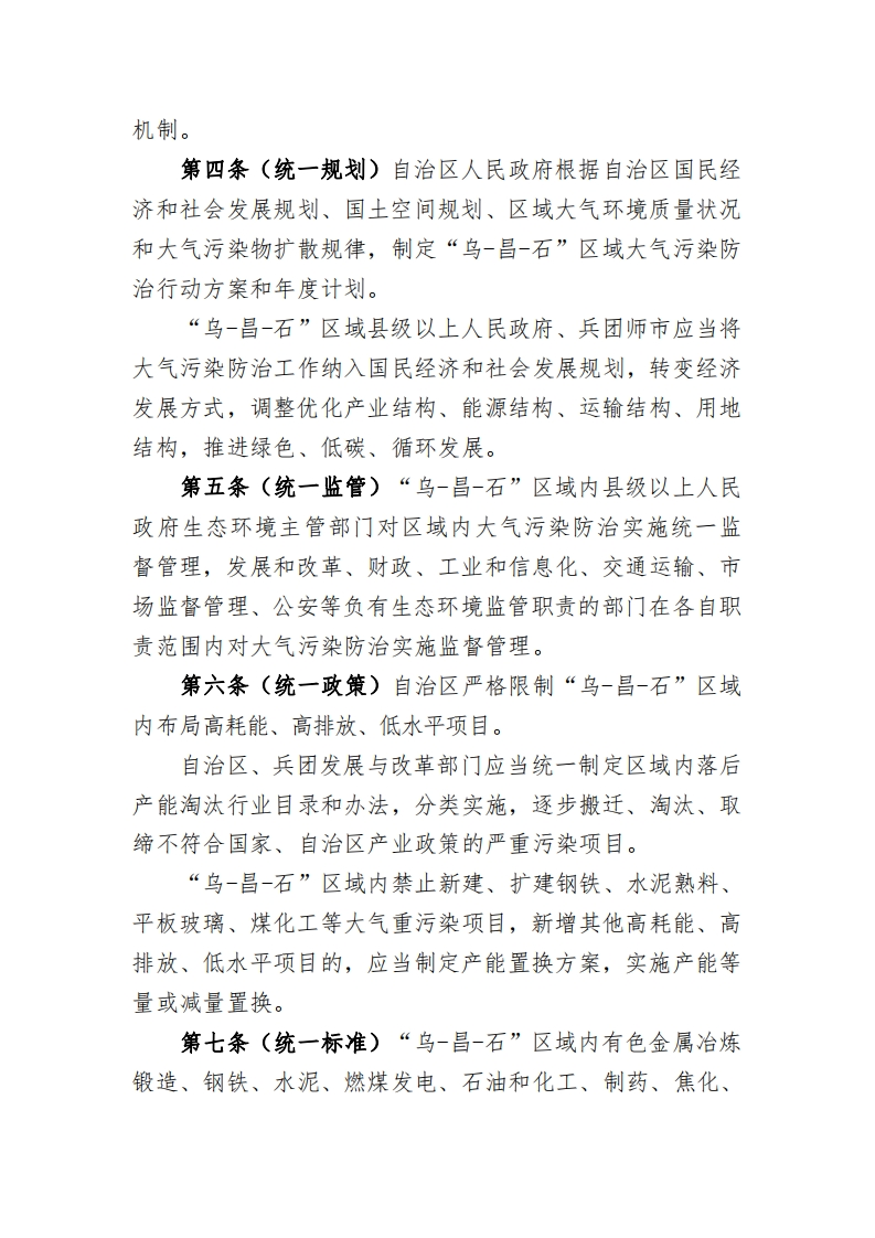 附件1《“乌-昌-石”区域大气污染防治条例》(征求意见稿)第一条(立法目的和依据)为保护和改善“鸟-昌-石”区域大气环境,防治大气污染,保障公众健康,推进生态文明建设,促进经济社会高质量发展,根据《中华人民共和国环境保护法》《中华人民共和国大气污染防治法》等有关法律、法规,结合区域实际,制定本条例。第二条(适用范围)本条例适用于自治区行政区域内“鸟-昌-石”区域大气环境的工业污染、燃煤污染、机动车污染的防治与监督管理。其他大气污染源的防治按照有关法律法规的规定防治。本条例所称“鸟-昌-石”区域包括鸟鲁木齐市、昌吉州昌吉市、阜康市、呼图壁县、玛纳斯县、塔城地区沙湾市、第六师五家渠市、第八师石河子市、第十二师。第三条(领导机构和工作机制)自治区成立自治区“鸟-昌-石”区域大气环境整治协调小组(以下简称协调小组),建立沟通协调机制,采取措施,促进污染减排、清洁能源替代,大宗货物运输结构调整、强化区域内大气环境信息共享及污染预警应急联动等,实现区域经济、社会、环境协调发展。“鸟-昌-石”区域大气污染防治工作,遵循区域共治和兵地共治的原则,按照统一规划、统一政策、统一标准、统一监管、统一考核的原则,建立区域大气污染联防联治协作