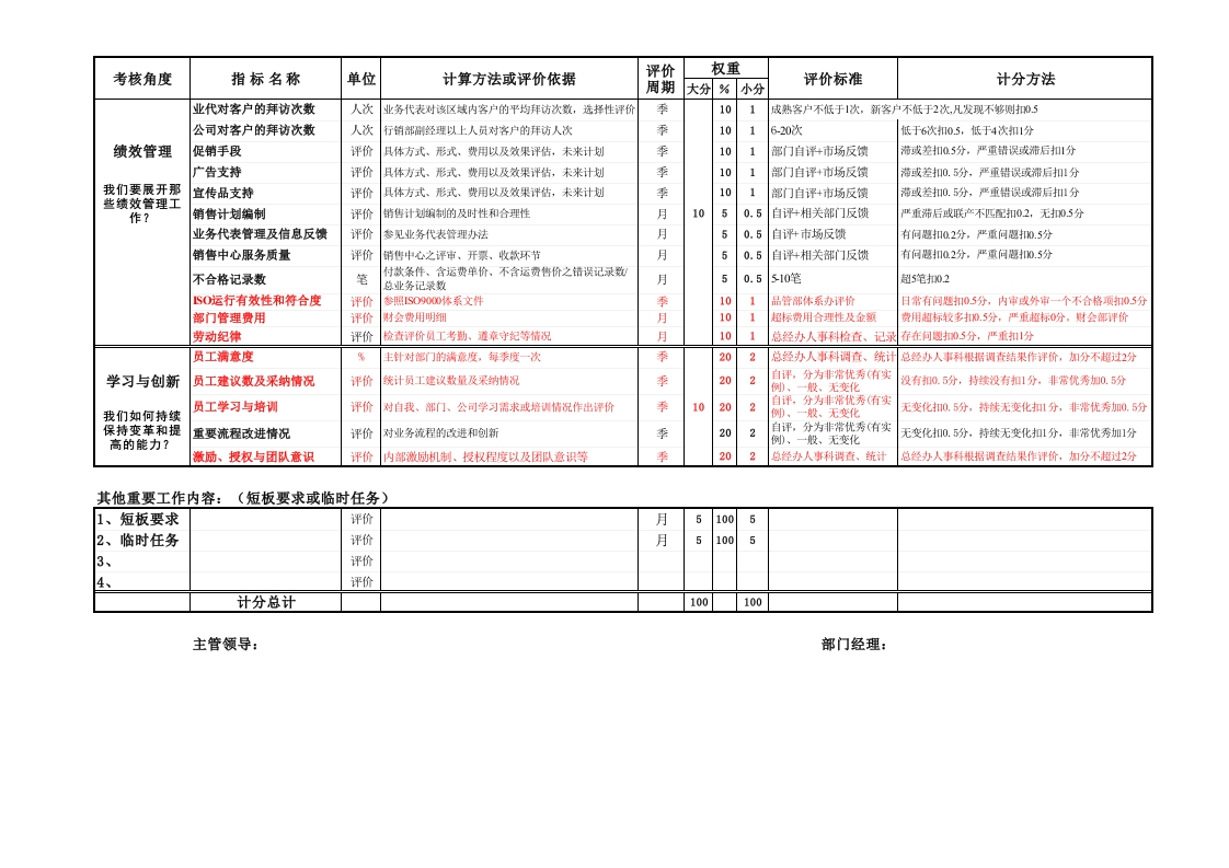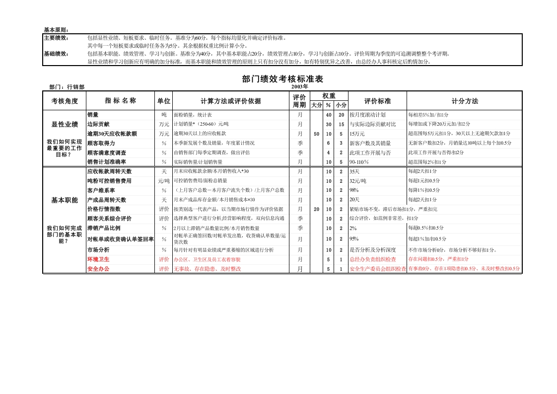 基本原则:主要绩效:包括显性业绩、短板要求、临时任务。基准分为6⑥0分。每个指标均量化并确定评价标准,其中每一个短板要求或临时任务各为5分。其余根据权重比例计算小分。基础绩效:包括基本职能、绩效管理、学习与创渐。基准分为40分,其中基本职能占20分,绩效管理占10分,学习与创渐占10分。评价周期为季度的可追溯调整整个考评期。显性业绩和学习创新应有明确的加分标准,而基本职能和绩效管理的原则上只有扣分没有加分,如有特别优异之改善,由总经办人事科核定后的情加分。部门绩效考核标准表部门:行销部2003年权重考核角度指标名称单位计算方法或评价依据评价周期大分⅓小分评价标准计分方法销量吨面粉销量,统计表月40四按月度滚动计划每相差5%加/扣1分显性业绩边际贡献万元计划销量*(25060)元吨月30的与实际边际贡献对比每增加或下降20万元加/扣2分逾期3天应收帐款额万元愈期30天以上的应收帐款月5010515万元超范围每5万元扣1分,30天以上无逾期欠款加1分我们如何实现顾客取得力%本季新发展个数及销量,年度累计情况季6新客户数及其销量无新客户数扣2分,月销量达10吨以上每个加05分最重要的工作目标7顾客满意度调查由销售部门每季定期调查,做出评估浴4%此项工作开展与否此项工作开展与否得2分销售计划准确率%实际销售量计划销售量月990-110%超范田每2%扣1分应收帐款周转天数天月末应收长款余额本月销售牧入◆30月10235天每超天扣1分吨粉可控销售费用元/吨可控销售费用面粉总销量月1032元/吨每超1元扣0.5分客户维系率(上月客户总数一本月客户流失个数)上月客户总数月1098%每降1%扣05分基本职能产成品周转天数天月末产成品库存金额/本月销售成本*3010920天每超2天扣1分价格行情指数评价按类别选一代表产品,以当期市场行情作为评价依据月2010紧贴市场不变,滞后市场扣1分。严重扣完顾客关系综合评价评价选择典型客户进行分析经营影响程度,双向信息沟通季10综合评价,如范例非常差,扣1分我们如何完成滞销产品比例%2月以上带销产品数量比例/本月销售数量季1022%每超0.5%扣0.5分部门的基本职能?对帐单或收货确认单签回率对帐单正确签回数对帐单发出数,收货确认单数量/运货次致10293%好超1%加扣0.5分市场分析每月针对有明显业绩成严重菱缩的区域进行分析月102是否分析及分析深度不作市场分析汾,市场分析不够好扣1分。环境卫生评价办公区、卫生区及员工衣着容貌月5总经办负责组织检查存在问愿扣05分,严重扣1分安全办公评价无事故、存在隐患、及时整改月5安全生产委员会组织检查有事故0盼、存在1项隐患扣0.5分、未及时整效扣05分