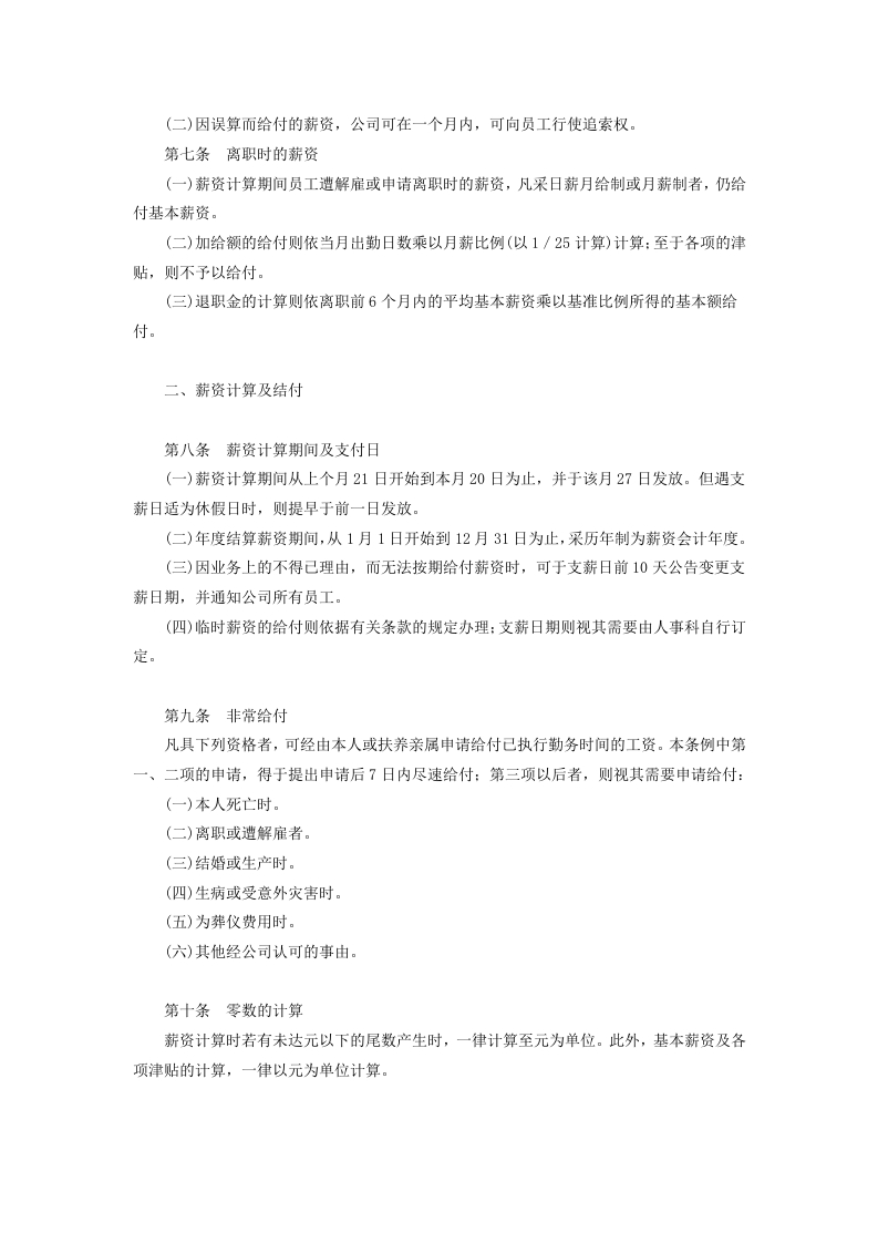 家电制造业薪资制度一、总则第一条目的本规则是依据人事管理规章的规定,订定员工薪资的相关事项。第二条薪资原则员工薪资是以社会水准、公司支薪能力、物价指数变化、本人担任工作的能力、经验、年龄等为考量的因素后,作为评估薪资标准的依据。第三条薪资结构薪资包括固定薪资及临时薪资两大部分。第四条支薪方法(一)薪资给付除特别规定的情况外,原则上由直属主管(管理职以上)直接将薪资交予本人:或委任会计科的经办人,直接交予本人。(二)薪资给付亦可经由下列的规定,直接将薪资(含临时奖金)全额或部分汇入员工的银行账户内。1.员工希望将薪资汇入本人的账户时,必须依照下列的规定,填具书面表格的手续后,交付会计科办理。(1)希望汇入本人账户内的薪资范围及金额。(2)员工指定的金融机关及存款类别、帐号。(3)申请手续必须在薪资结算前10天办妥,方可生效。2.金融机关的指定原则上以与公司有所往来或公司指定的金融机关为主。但在公司认为有其必要时,可在本人申请指定的金融机关办理。第五条扣除金下列规定可从每月薪资中直接扣除:(一)法令规定事项。(二)基于薪资扣除的规定,并与工会取得协议的事项。第六条薪资的偿还与处理(一)虚报、怠于申报及误算时的溢领,必须在发现后立即偿还。