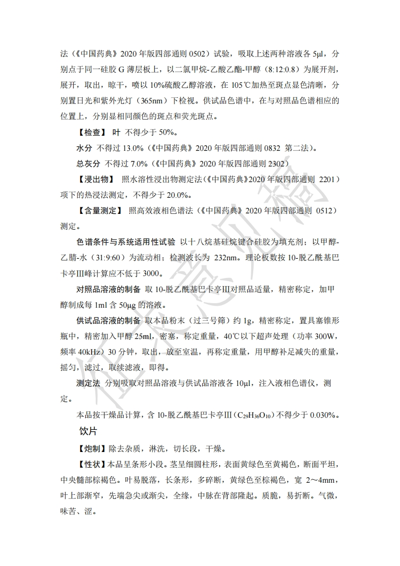 南方红豆杉质量标准草案(征求意见稿)南方红豆杉NanfanghongdoushanTAXI MAIREI RAMULUS ET FOLIUM【来源】本品为红豆杉科植物南方红豆杉Taxus wallichiana var.mairei(Lemee et H.Leveille)L.K.Fu et Nan Li栽培品的干燥带叶小枝。春季和夏季采收,除去杂质后干燥。【性状】本品枝呈细圆柱形,表面黄绿色至黄褐色,稍糙,栓皮易成小片状剥离,断面平坦,淡棕红色,中央髓部棕褐色。叶易脱落,呈螺旋状互生,排成2列,长条形,微弯,长1.5~4.5cm,宽2~4mm,叶上部渐窄,先端急尖或渐尖,叶柄短,叶基扭转:叶片全缘,近革质,上表面深绿色或棕褐色,有光泽,下表面淡黄绿色或棕褐色,中脉在背部隆起。质脆,易折断。气微,味苦、涩。【鉴别】(1)枝横切面:外被角质层,黄色,木栓层为5~10列细胞,长方形。皮层窄,为类圆形薄壁细胞,排列疏松,细胞壁常含草酸钙砂晶。韧皮部较狭,石细胞成群或单个散在。木质部宽广,管胞明显,顶面观类方形,排列整齐,髓部中空,髓及射线明显。叶横切面:上表皮细胞1列,长圆形,排列紧密,外被角质层;下表皮细胞较上表皮细胞略大,多角形,角质层较厚:与中脉相邻的为2条气孔带,气孔带外被角质乳头状突起。边带宽,为数十列细胞,椭圆形,内含棕黄色物质。栅栏组织细胞为1一2列,有草酸钙砂晶散在,晶体较小多为不规则形。中央为双韧型维管束,木质部发达,韧皮部窄。本品粉末黄绿色至黄褐色。表皮细胞椭圆形或长方形,气孔易见,多为不定式,凹陷,侧面观保卫细胞呈哑铃形。石细胞呈类椭圆形或不规则多边形,淡黄色,壁厚,孔沟明显。薄壁细胞椭圆形,内含草酸钙砂晶及油滴。螺纹管胞多见,直径8~26μm.(2)取本品粉末3g,加甲醇50ml,超声处理30分钟,滤过,滤液蒸干,残渣加乙酸乙酯5m1使溶解,作为供试品溶液。另取10-脱乙酰基巴卡亭Ⅲ对照品适量,加乙酸乙酯制成每1ml含0.2mg的溶液,作为对照品溶液。照薄层色谱
