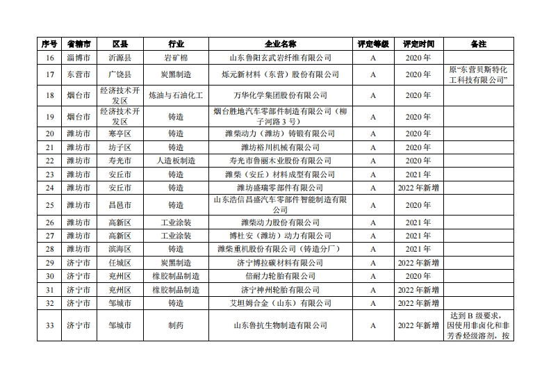 山东省2022年重污染天气重点行业绩效评级A级企业名单序号省精市区县行业企业名称评定等级评定时间备注1济南市历下区炼油与石油化工中国石油化工股份有限公司济南分公司A2020年原中国重汽集团2济南市章丘区铸造中国重汽集团济南动力有限公司成型厂2020年济南动力有限公司铸锻中心”3济南市钢城区焦化山东钢铁股份有限公司莱芜分公司焦化2020年4济南市钢城区石灰窑山东鲁碧建材有限公司钢城分公司A2020年5济南市钢城区长流程联合钢铁莱芜钢铁集团银山型钢有限公司A2022年新增6济南市平阴县铸造玫德集团有限公司科技园A2020年7济南市平阴县铸造玫德集团有限公司孝直分厂A2020年8济南市商河县玻璃山东力诺特种玻璃股份有限公司A2020年9青岛市西海岸新区石灰窑青岛斯迪尔新材料有限公司A2022年新增10青岛市西海岸新区长流程联合钢铁青岛特殊钢铁有限公司A2022年新增11青岛市莱西市防水建筑材料制造青岛东方雨虹建筑材料有限公司A2021年12淄博市周村区工业涂装山东京宏智能科技有限公司A2022年新增中因石油化工股份有限公司齐鲁分公司13淄博市临淄区炼油与石油化工第二化肥厂A2020年临淄区炼油与石油化工中国石油化工股份有限公司齐鲁分公司14淄博市塑料厂2020年15淄博市桓台县耐火材料淄博雷法耐火材料有限公司A2022年新增