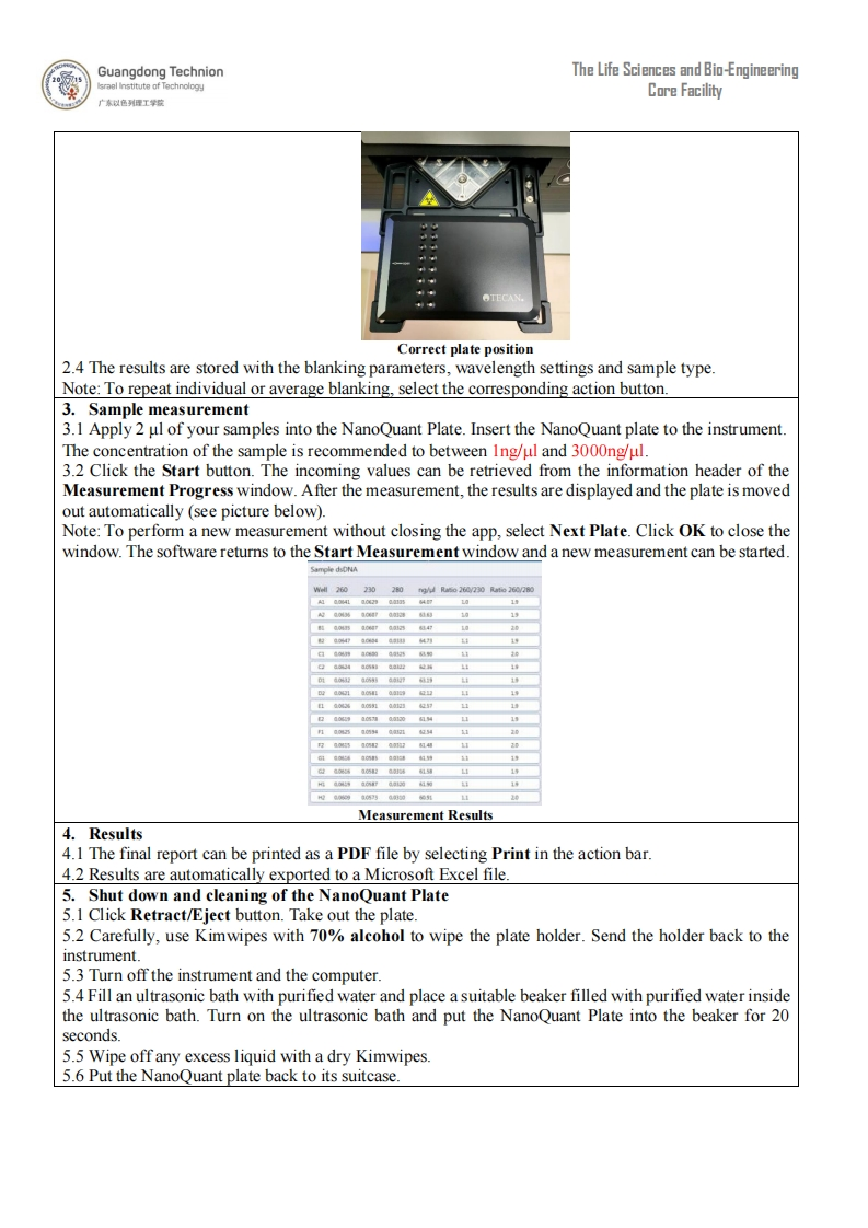 Guangdong TechnionThe Life Sciences and Bio-Engineeringsraal linstitute of TechnologyCore Facility广麻以色列理工学院Operating Instructions NanoQuantModel and Manufacturer:Tecan,SparkSafety:Wear gloves when inserting the plate to the Plate Reader.-Do not leave the plate inside the instrument.Might be harmful.Do not use gloves when using the computer.Inform the Core Facility staff for any safety issue or misuse of the instrument.1.Start1.1 Switch on the plate reader to preheat 20 min before use.Turn on the computer.A blue light willturn on.ATECAN.Main SwitchBlue LightControl PanelNanoQuant Plate Set1.2 Log in to the Bookitlab system and activate the software.1.3 The plate holder will come out automatically after opening the software.Click Retract/Ejectbutton (red circle above)to retract it temporarily.1.4 Open the Tecan Sparkcontrol software,select Nucleic Acid Quantitation2.Blanking2.1 Select a sample testing type:ds DNA,ssDNA and RNA(by default 'ds DNA'is selected).2.2 Select the blanking wells(A1,A2...H1,H2)by clicking on them.The 'blue dots'will turn yellowwhen selected.圃@二2.3 Select Individual Blanking to start the individual blanking procedure or Average Blanking to startthe average blanking procedure.After selecting,the plate holder will come out automatically.2.4 Insert the NanoQuant Plate with the respective blanking samples.Make sure the TECAN logo is atthe right bottom corner(see picture below).Click OK to do the blanking.