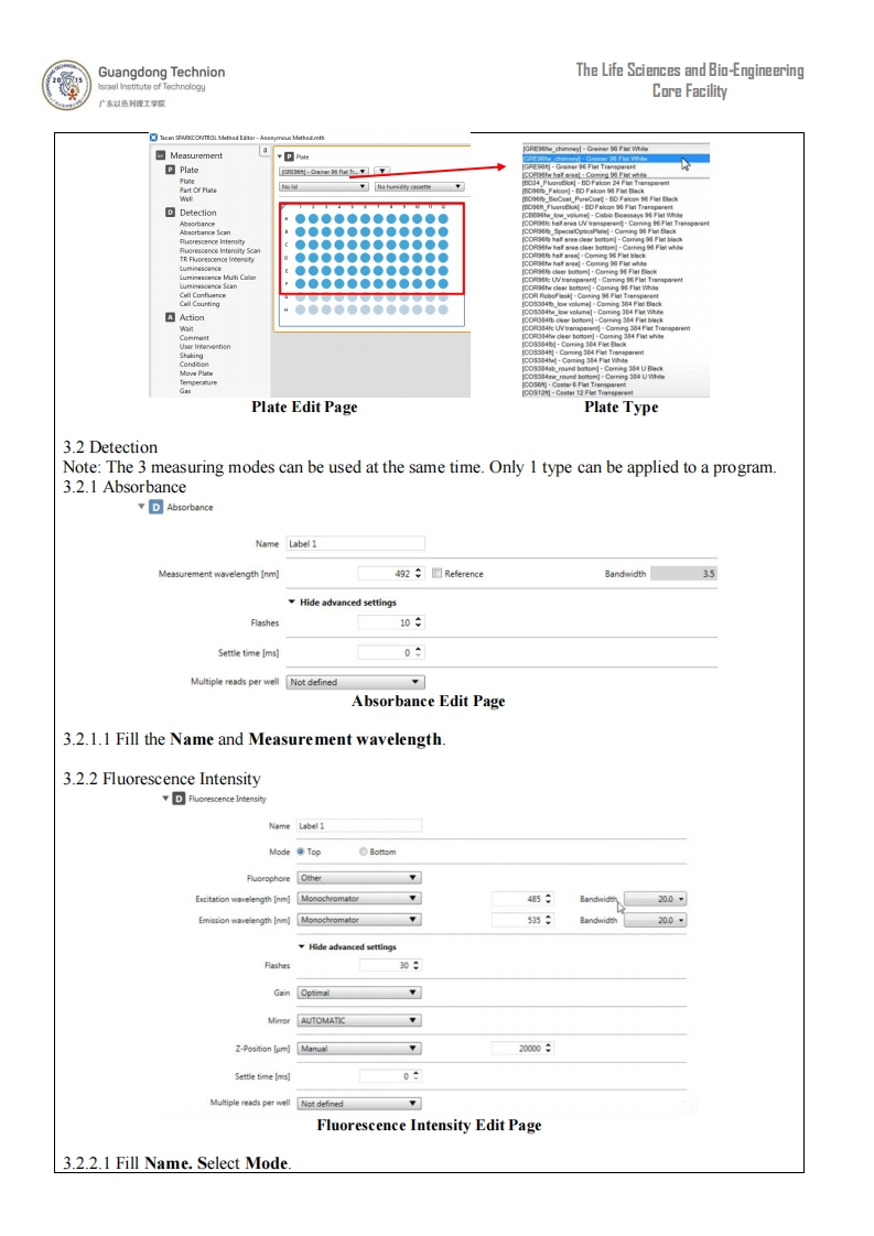 Guangdong TechnionThe Life Sciences and Bio-Engineeringsraal linstitute of TechnologyCore Facility广麻以色列理工学统Operating Instructions -Plate ReaderModel and Manufacturer:Tecan,SparkSafety:Wear gloves when inserting the plate to the Plate Reader.-Do not leave the plate inside the instrument.Might be harmful.Do not use gloves when using the computer.Inform the Core Facility staff for any safety issue or misuse of the instrument.1.Start1.1 Switch on the plate reader to preheat 20 min before use.Turn on the computer.A blue light willturn on.OTECAN.Main SwitchBlue LightControlPanel on Plate Reader1.2 Log in to the Bookitlab system and activate the software.1.3 The plate holder will come out automatically after opening the software.Click Retract/Ejectbutton(red circle above)to retract it temporarily2.Create a Program2.1 Choose Create/edit a method.Click(red circle below)Weard List-Sparkcontrolgean V3.1What do you want to do?Start measurement The Start Maaauramant wizard holps you toEvaluate resultsCreate/ed sample IDCreate/Edit a MethodCreate/edt a methodNew甲3sOpen2.2 Choose New to create a new program or Open to edit a program.2.3 Select a location to store the program you create/edit (preferably not on drive C:)3.Program Setting3.1 Plate3.1.1 Select the exact plate which contains your samples.3.1.2 Select plate lid.(No lid or lid)3.1.3 Choose which wells should be measured.Dark blue wells will be measured (red rectangle below).