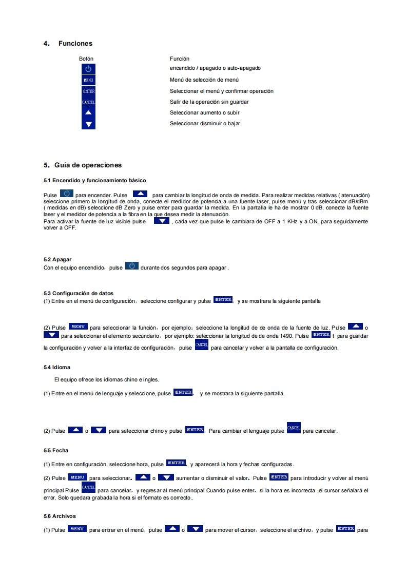 1.Informacion generalEl multimetro optico ADOM es portatil,resistente y duradero y se utiliza para la instalacion,operacion y mantenimiento de una redde fibra optica.Con forma compacta funcion de apagado automatico,amplio rango de medicion optica de potencia,precision de lamedicion y con la funcion que ofrece al usuario de auto-calibracion y diseno de la interfaz en general que ademas muestra el indicelineal mW )y la visualizacion de indice no lineal dBm)en la misma pantalla.El multimetro incluye una fuente de luz visible de alta potencia de 30 mw y 650 nm,..回a回ans2.CaracteristicasOpcion de auto calibrado por el usuarioBateria de litio recargable para reducir gastos al usuario.Visualizacion del indice lineal(mw)y no lineal (Dbm)en la misma pantallaAjuste de la funcion de apagado automatico.Alta estabilidad en multiples longitudes de onda de salida laser,modo onda continua o modulada.Pantalla color LCD.Los datos se pueden cargar enel PC.3.EspecificacionesRango de medida-50-+26Tipo de sondaInGaAsRango de longitud de800-1700de ondaIncertidumbre±5%Longitud de onda850、980、1300、1310、1490、1550,1625(nm)ResolucionIndicacion lineal:0.1%Indicacion logaritmica:0.01dBmConectorGeneral FC/PC SC/PCPartes fuente de luzModeloLongitud de ondaPotenciaConectorLongitud de onda (nm)650nm30 mlFCySCOtrosResolucionIndicador lineal:0.1%Indicador logaritmico:0.01dBmTemperatura de trabajo-16-+60Temperatura de almacenaje-25+70Tiempo de apagado automatico (min)10Horas de trabajo continuas (h)Mas de 15horasPantalla2.4 TFT color LED con retro-iluminacionDimensiones(mm)190×100×48Fuente de energiaBateria recargable de litioPeso (g)280