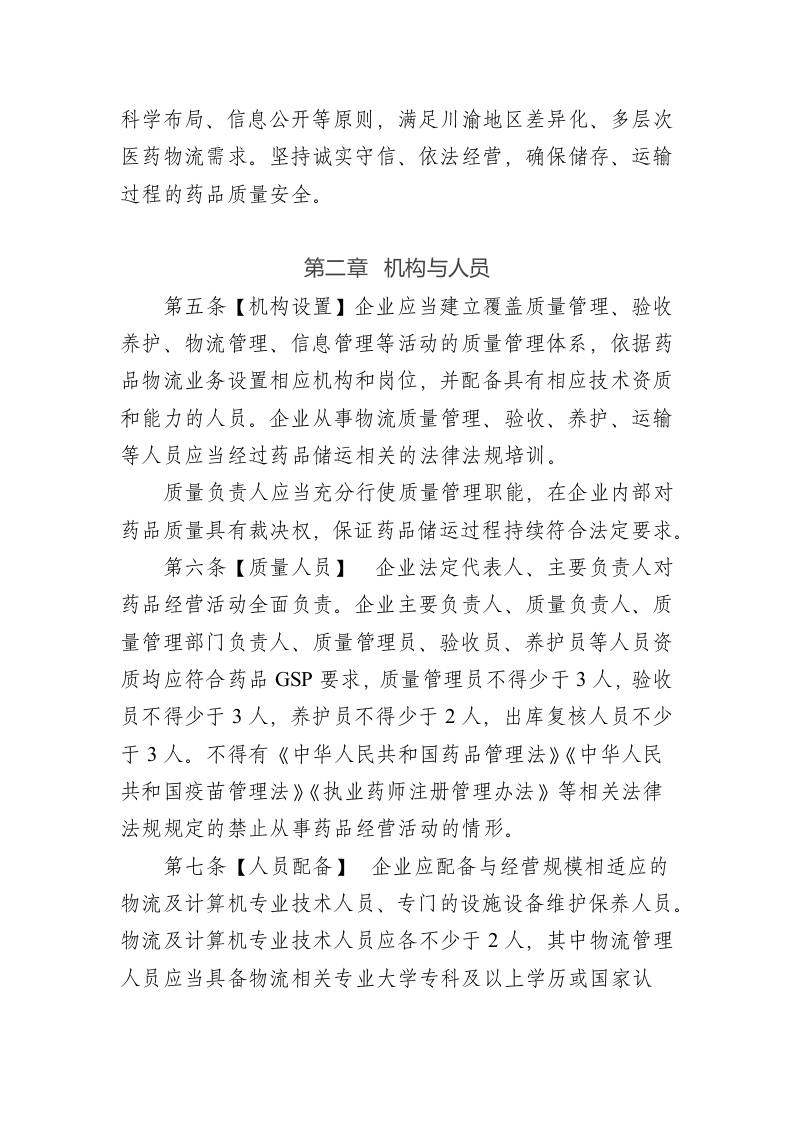 附件1药品第三方现代物流指导意见(征求意见稿)第一章总则第一条【目的和依据】为规范重庆市、四川省药品第三方现代物流建设,促进药品流通行业高质量发展,根据《中华人民共和国药品管理法》《药品经营和使用质量监督管理办法》《药品经营质量管理规范》(以下简称药品GSP)等法规要求,结合辖区实际,制定本指导意见。第二条【适用范围】本指导意见适用于重庆市、四川省辖区内接受委托储存、运输药品的第三方药品现代物流企业。第三条【企业定义】药品第三方现代物流企业(以下简称企业)是指接受药品上市许可持有人、药品经营企业以及法律法规允许的单位(以下简称委托方)委托储存、运输药品的企业。企业应是具有独立法人资格的市场主体,具备药品现代物流条件,建立符合药品GSP要求并与其药品现代物流服务相适应的质量管理体系和信息追溯体系,采用信息化手段对药品储存、运输活动进行如实记录,确保全过程药品质量安全及数据真实、准确、完整、实时、可追溯。第四条【基本要求】企业坚持需求导向、统筹规划、