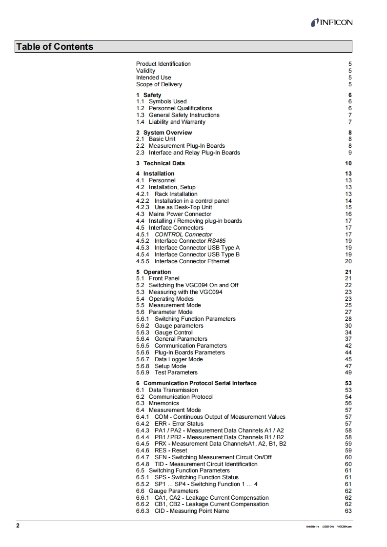 操作说明书手册VGC094348072@abc6个月前发布关注私信00操作说明书手册VGC094此内容为付费资源,请付费后查看¥22¥33黄金会员免费钻石会员免费立即购买您当前未登录!建议登陆后购买,可保存购买订单付费资源 第1页 / 共114页 第2页 / 共114页 试读已结束,还剩112页,您可下载完整版后进行离线阅读 THE END说明书手册 文本预览 INFICONINFICON vaco94是是咖间日日回兰回题夕公Operating ManualIncl.EU Declaration of ConformityVGC094Total Pressure Gauge Controllertinb68e1-a(2025-04)1 查看更多 收起部分 喜欢就支持一下吧收藏