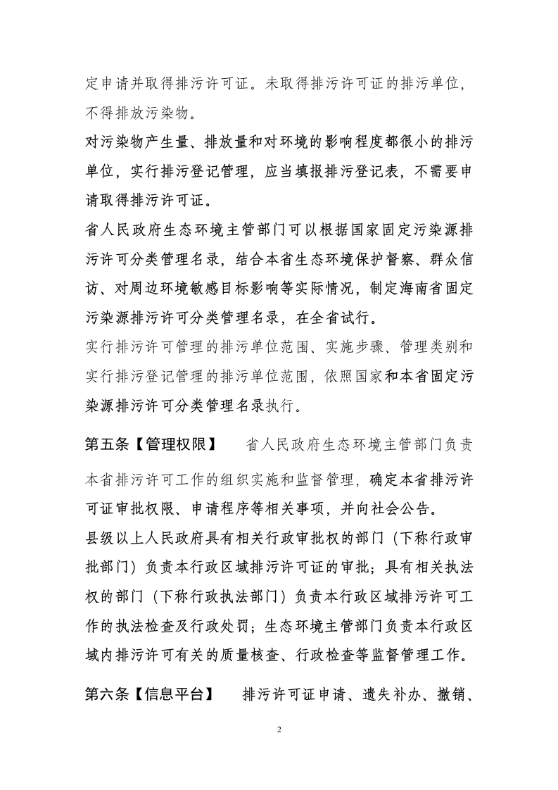 附件2海南省排污许可管理条例(修订草案)第一章总则第一条【目的】为了规范排污许可管理,加大环境保护力度,严格控制污染物排放,持续改善生态环境质量,根据《中华人民共和国环境保护法》《排污许可管理条例》等有关法律法规,结合本省实际,制定本条例。第二条【适用范围】本省行政区域内排污许可的申请、审批、实施及其监督管理活动,适用本条例。第三条【原则】排污许可管理坚持精简高效、公平公正、权责清晰、社会共治的原则。第四条【分类】本省根据排放污染物的企业事业单位和其他生产经营者(以下简称排污单位)污染物产生量、排放量、对环境的影响程度等因素,实行排污许可重点管理、简化管理和排污登记管理。对污染物产生量、排放量或者对环境的影响程度较大的排污单位,实行排污许可重点管理;对污染物产生量、排放量和对环境的影响程度较小的排污单位,实行排污许可简化管理。实行重点管理和简化管理的排污单位应当按照本条例规