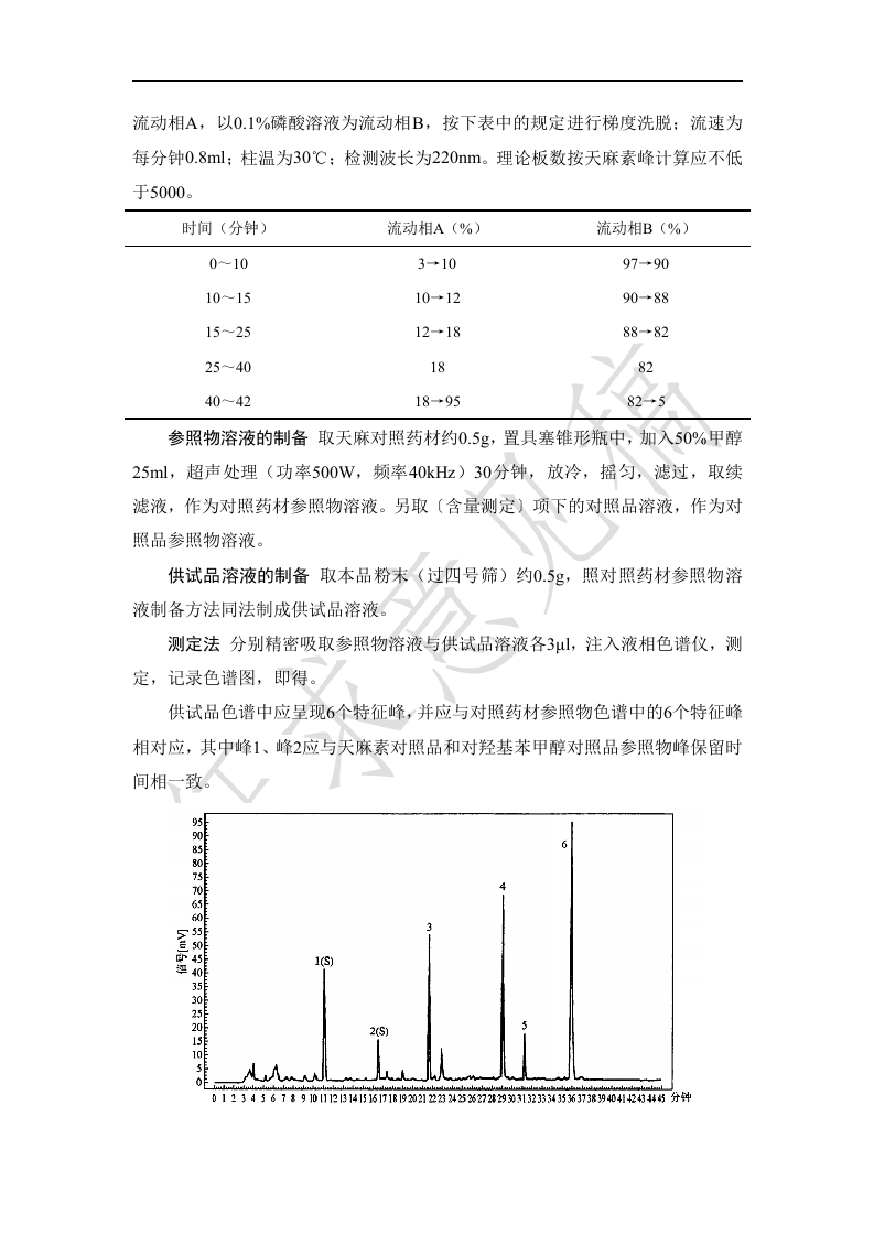 天麻质量标准草案(征求意见稿)天麻TianmaGASTRODIAE RHIZOMA【来源】本品为兰科植物天麻Gastrodia elata Bl.的新鲜块茎。立冬后至次年清明前采挖。【炮制】取鲜天麻,洗净,蒸透,切横片,冷冻干燥【性状】本品呈类圆形的片,直径1.5~6.0cm,厚0.2-1.0cm。外表皮黄白色至淡黄棕色,有的可见潜伏芽排列而成的横环纹,有时可见棕褐色菌索。有的有残留茎基或圆脐形疤痕。切面黄白色,显粉性,质疏脆,有的有空洞裂隙。气微,味甘。【鉴别】(1)本品粉末黄白色至黄棕色。厚壁细胞椭圆形或类多角形,直径70~180μm,壁厚3~8um,木化,纹孔明显。草酸钙针晶成束或散在,长25~75(93)。用甘油醋酸试液装片观察含糊化多糖类物的薄壁细胞无色,有的细胞可见长卵形、长椭圆形或类圆形颗粒,遇碘液显棕色或淡棕紫色。螺纹导管、网纹导管及环纹导管直径8~30μum。(2)取本品粉末1g,加甲醇10ml,超声处理30分钟,滤过,滤液浓缩至干,残渣加甲醇1ml使溶解,作为供试品溶液。另取天麻对照药材1g,同法制成对照药材溶液。再取天麻素对照品,加甲醇制成每1ml含1mg的溶液,作为对照品溶液。照薄层色谱法(《中国药典》2020年版四部通则0502)试验,吸取供试品溶液和对照药材溶液各10μl、对照品溶液5,分别点于同一硅胶G薄层板上,以二氯甲烷-乙酸乙酯-甲醇-水(2:4:2.5:1)为展开剂,展开,取出,晾干,喷以对羟基苯甲醛溶液(取对羟基苯甲醛0.2g,溶于乙醇10ml中,加50%硫酸溶液1ml,混匀),在120℃加热至斑点显色清晰,置日光下检视。供试品色谱中,在与对照药材色谱和对照品色谱相应的位置上,显相同颜色的斑点。【特征图谱】照高效液相色谱法(《中国药典》2020年版四部通则0512)测定。色谱条件与系统适用性试验以十八烷基硅烷键合硅胶为填充剂:以乙腈为