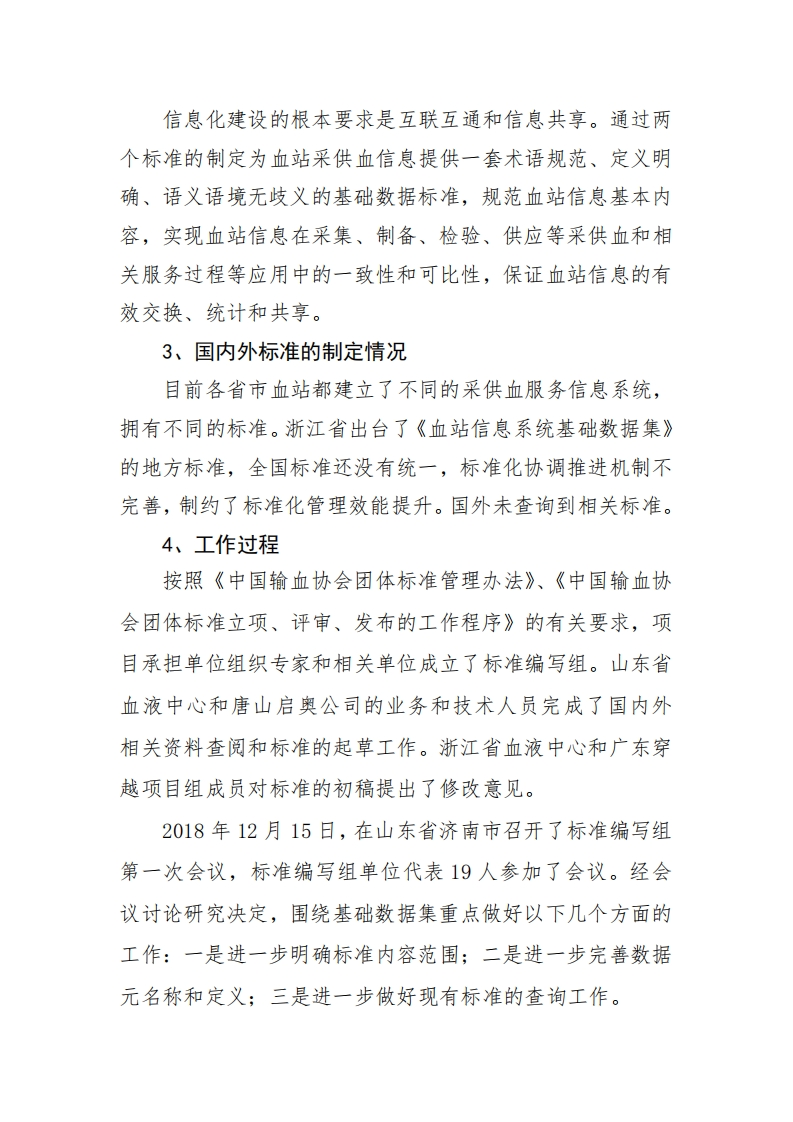 团体标准《采供血管理信息系统指南第1部分:基础数据集》编写说明1、项目背景中国输血协会高度重视标准化建设工作,2018年5月23日,中国输血协会血液质量专业委员会批准了采供血管理信息系统指南第1部分:基础数据集(以下简称基础数据集)编写立项工作,该项工作由山东省血液中心、浙江省血液中心、唐山启奥科技股份有限公司、广东穿越医疗科技有限公司等单位共同承担。2、标准制定的必要性分析当前,全国各省市血站都高度重视信息化建设,都已实现了采供血业务的信息化管理,形成了一批重要的信息资源,主要有采供血、设备试剂耗材物料、质量、财务、安保视频监控、宣传等方面结构化或非结构化信息。同时,医疗机构在电子病历数据库建设中形成了大量的临床用血信息,以及浆站的献浆者信息、红会的中华骨髓库、脐血库等信息。很多省(市、自治区)实现了省与各地市血站的网络互联互通和采供血信息共享,开展了省级范围内应急调血的网上审批、献血者屏蔽、大数据挖掘等应用,血液信息共享应用效果初步显现。但是,由于全国没有统一的血液信息化标准和管理规范,造成信息孤岛现象十分突出,各厂家标准不一,信息对照转换工作量大,甚至有些项目无法精确转换,协调难度也很大,导致信息共享难,开发利用严重不足。