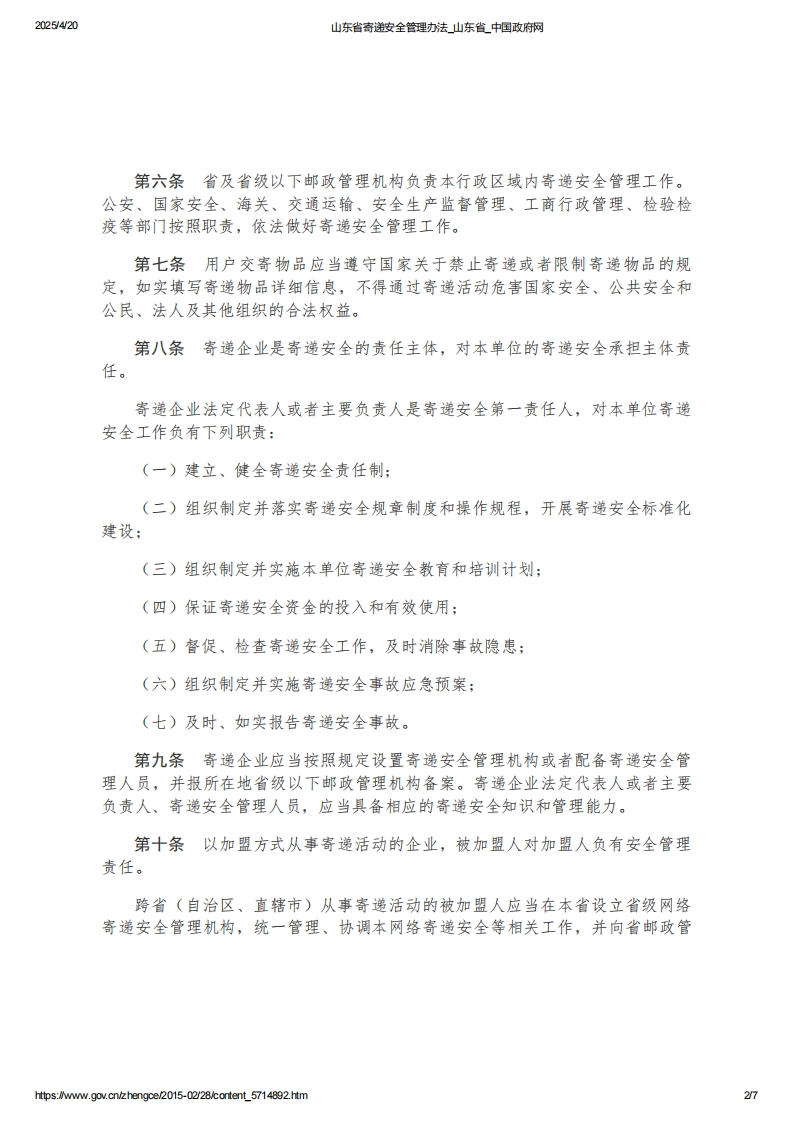 20254W20山东省寄递安全管理办法山东省中国政府网中华人民共和国中央人民政府www.gov.cn山东省人民政府规章米源:山东省人民政府网站山东省寄递安全管理办法(2015年2月26日山东省人民政府令第286号公布自2015年5月1日起施行)第一条为了保障社会公共安全和寄递信息、寄递物品安全,维护用户和寄递企业的合法权益,规范寄递活动,根据《中华人民共和国邮政法》、《山东省邮政条例》等有关法律、法规,结合本省实际,制定本办法。第二条本省行政区域内寄递安全管理活动适用本办法。第三条本办法所称寄递,是指将信件、包裹、印刷品等物品按照封装上的名址递送给特定个人或者单位的活动,包括收寄、分拣、运输、投递等环节。本办法所称寄递企业,是指从事信件、包裹、印刷品等物品收寄、分拣、运输、投递等全部或者部分环节活动的单位,包括邮政企业、快递企业以及其他相关企业等。第四条寄递安全管理实行属地管理与分级管理相结合的原则,坚持安全第一、预防为主、综合治理的方针,建立企业负责、政府监管、行业自律和社会监督的机制。第五条县级以上人民政府应当建立健全本行政区域内寄递安全管理协调机制,研究解决寄递安全管理工作中的重大问题,明确相关部门配合邮政管理机构做好寄递安全管理工作。https://www.gov.cn/zhengce/2015-02/28/content_5714892.htm1/7