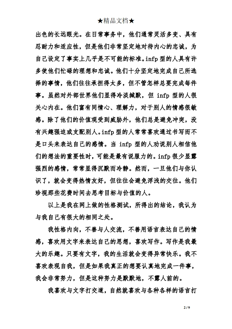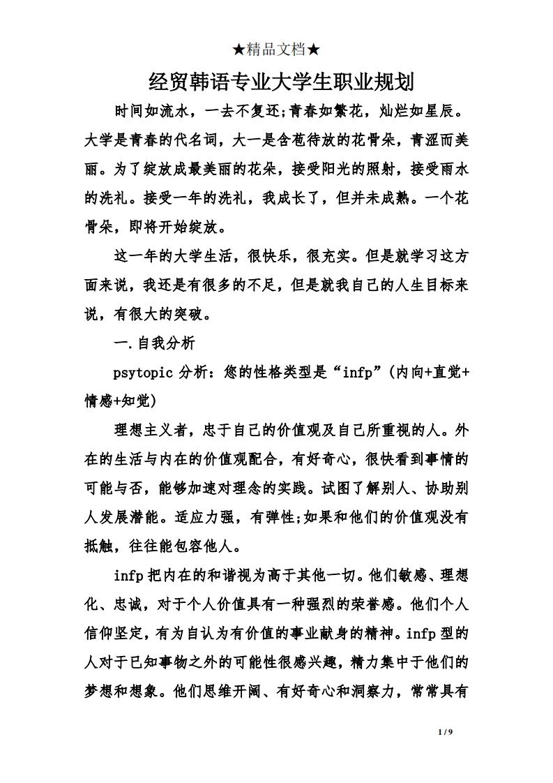 ★精品文档★经贸韩语专业大学生职业规划时间如流水,一去不复还;青春如繁花,灿烂如星辰。大学是青春的代名词,大一是含苞待放的花骨朵,青涩而美丽。为了绽放成最美丽的花朵,接受阳光的照射,接受雨水的洗礼。接受一年的洗礼,我成长了,但并未成熟。一个花骨朵,即将开始绽放。这一年的大学生活,很快乐,很充实。但是就学习这方面来说,我还是有很多的不足,但是就我自己的人生目标来说,有很大的突破。一.自我分析psytopic分析:您的性格类型是“infp”(内向+直觉+情感+知觉)理想主义者,忠于自己的价值观及自己所重视的人。外在的生活与内在的价值观配合,有好奇心,很快看到事情的可能与否,能够加速对理念的实践。试图了解别人、协助别人发展潜能。适应力强,有弹性;如果和他们的价值观没有抵触,往往能包容他人。infp把内在的和谐视为高于其他一切。他们敏感、理想化、忠诚,对于个人价值具有一种强烈的荣誉感。他们个人信仰坚定,有为自认为有价值的事业献身的精神。infp型的人对于已知事物之外的可能性很感兴趣,精力集中于他们的梦想和想象。他们思维开阔、有好奇心和洞察力,常常具有1/9