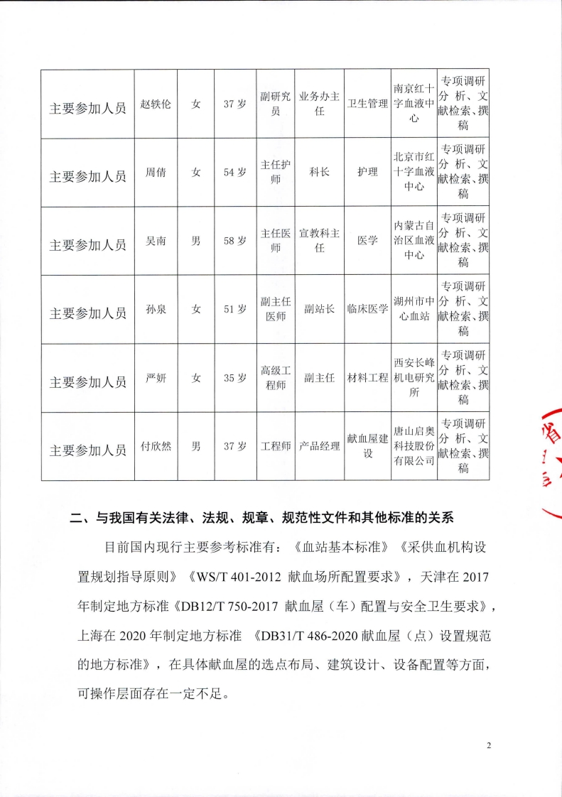 《血站业务场所建设指南第3部分:献血屋》编制说明一、任务来源与项目编号、参与协作单位、简要起草过程、主要起草人及其所承担的工作2022年8月,受中国输血协会委托,浙江省血液中心、北京市红十字血液中心、湖州市中心血站、河北省血液中心、大连市血液中心、南京红十字血液中心、内蒙古自治区血液中心、西安长峰机电研究所、唐山启奥科技股份有限公司共9家血液中心、中心血站和公司成立项目组,承担《血站业务场所建设指南第3部分:献血屋》的编制任务。该项目编号为:P2022-002。项目组收集、参考国内外相关标准,结合行业发展趋势和各地调研结果,确定了标准的框架结构和基本内容,形成了标准征求意见稿。项目组主要参与人员及承担的工作如下:研制人员姓名性别年龄职称职务专业单位任务分工副主任中心副主浙江省血总负责、总项目负责人刘晋辉男46岁输血技术技师任液中心撰稿浙江省血政策指导、主要参加人员金立明男36岁工程师副科长软件工程液中心撰稿主任技质量法规架构设计、血液质量河北省血主要参加人员常缨男54岁师处处长管理液中心文献检索、撰稿专项调研血液质量主要参加人员宫本兰女主任技58岁师科长与业务管大连市血分析、文液中心理献检索、撰稿