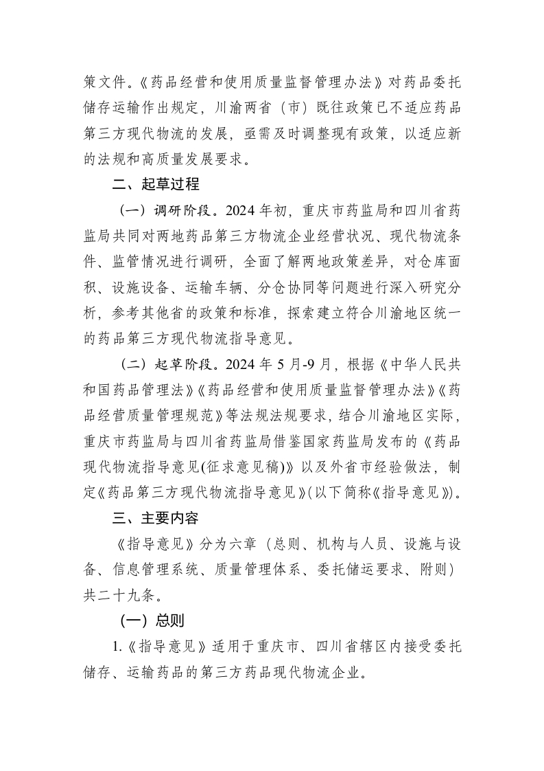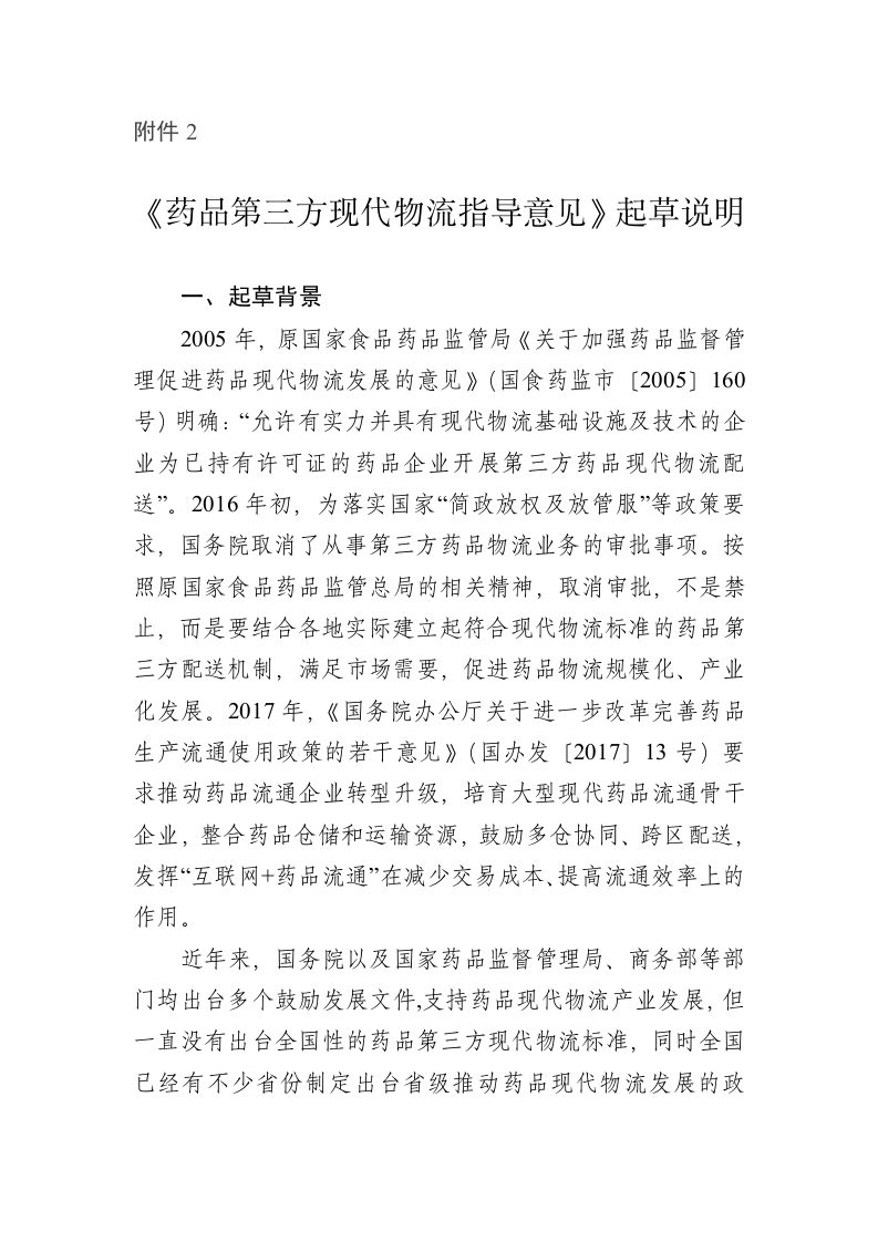 附件2《药品第三方现代物流指导意见》起草说明一、起草背景2005年,原国家食品药品监管局《关于加强药品监督管理促进药品现代物流发展的意见》(国食药监市[2005]160号)明确:“允许有实力并具有现代物流基础设施及技术的企业为已持有许可证的药品企业开展第三方药品现代物流配送”。2016年初,为落实国家“简政放权及放管服”等政策要求,国务院取消了从事第三方药品物流业务的审批事项。按照原国家食品药品监管总局的相关精神,取消审批,不是禁止,而是要结合各地实际建立起符合现代物流标准的药品第三方配送机制,满足市场需要,促进药品物流规模化、产业化发展。2017年,《国务院办公厅关于进一步改革完善药品生产流通使用政策的若干意见》(国办发[2017]13号)要求推动药品流通企业转型升级,培育大型现代药品流通骨干企业,整合药品仓储和运输资源,鼓励多仓协同、跨区配送,发挥“互联网+药品流通”在减少交易成本、提高流通效率上的作用。近年来,国务院以及国家药品监督管理局、商务部等部门均出台多个鼓励发展文件,支持药品现代物流产业发展,但一直没有出台全国性的药品第三方现代物流标准,同时全国已经有不少省份制定出台省级推动药品现代物流发展的政