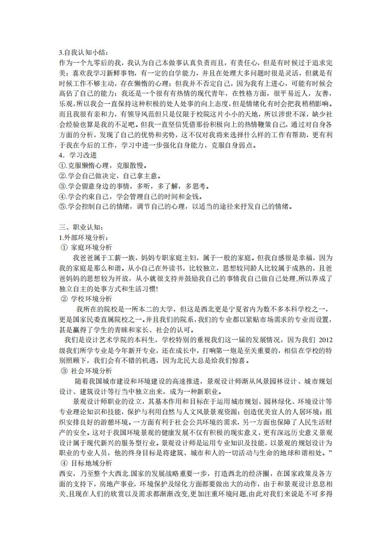前言:每个人都有自己的人生理想,都会为自己的未来制定一份规划。作为一名当代大学生,走在人生的转折道路上,内心不免有些慌乱,不知所措。面对未来,我们应该做些什么,应该怎样去做,是时刻困扰我们的人生难题。我们不应该把大学当作人生的避难所,只知道无休止地享受和索取,昏天寥日的堕落。我们应该做的,是理性的面对现实,面对自我,学会做人,学会做事,不管未来的人生旅途多么艰难和危险,都应该勇敢地面对。相信只要我们做好充分的准备,充满十足的信心,任何困难都难不倒坚强的自我,我们的人生也会更加精彩和丰富。设计艺术学院是一个大的百花园,我只是百花园里一棵不起眼的小草,可小小草有一个大大的理想。在今天这个人才竞争的时代,职业生涯规划开始发挥它巨大的作用,成为在人与人争夺战中的的另一重要利器。记得这么一句话说“梦虽虚幻,却是自己的梦想:位虽低微,却是自己的岗位:屋虽简陋,却是自己的家:志虽渺小,却是自己的追求。”所以,本着对自己负责,对人生负责的态度,我试着为自己拟一份职业生涯规划。希望在未来的人生道路中可以点燃一盏明灯为自己照亮前行的道路。下面便是我为自己做的一个简单的职业生涯规划。一、目标制定英国的诗人华兹华斯说过“一个崇高的目标只要不渝的追求,就会成为壮举”所以没有目标的人生是无意义的人生。阶段目标:学习专业知识,丰富阅历,吸取经验,过英语四级,通过所有等级考试,优秀毕业,成功就业总体目标:做一个优秀的景观设计师并有属于自己的公司。二.自我认知1.优点:①.自我评估:有责任心,做事认真,有热情,有学习新事物的欲望,自学能力强,做事很灵活,做事果断有条理。喜欢社交,有广泛的交往圈。②.老师领导评估:学习兴趣浓厚,成绩良好,尊敬师长,工作认真负责,待人热情,同学关系好,有一定的领导能力。③.父母家人评估:工作起来的时候很认真很投入,有非完成不可的决心,喜欢自己创作,动手能力强,手巧,观察能力强,很乐观,听父母的话关心父母!④.同学朋友评估:待人热情,平易近人,乐于助人,为人有正气,学习认真负责,有礼貌,很活泼,很乐观,想象力丰富,很重感情!⑤.部门评估:有责任心,工作认真,有上进心,主动性强2.缺点:①.自我评估:做事有时不够主动,耐心不够,自控能力较弱,有时喜欢自我满足。②.老师领导评估:有时做事不够细心,比较容易情绪化,太太重感情。③.父母家人评估:缺乏一定的生活常识,有的时候缺乏主见,做事比较喜欢虎头蛇尾,思想太单纯不够成熟④.同学朋友评估:有时太过于过于追求完美,情绪化,在某些情况下还比较喜欢感情用事。·⑤.部门评估:涉世未深,做事不够凌厉.
