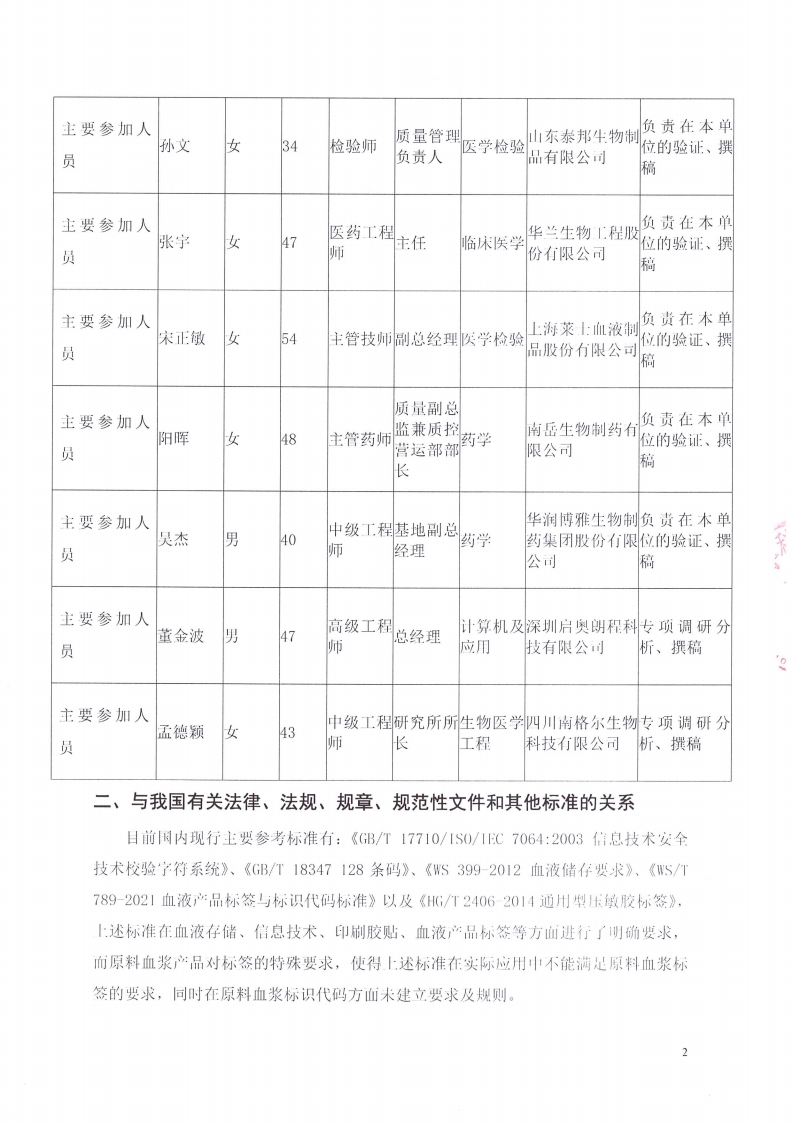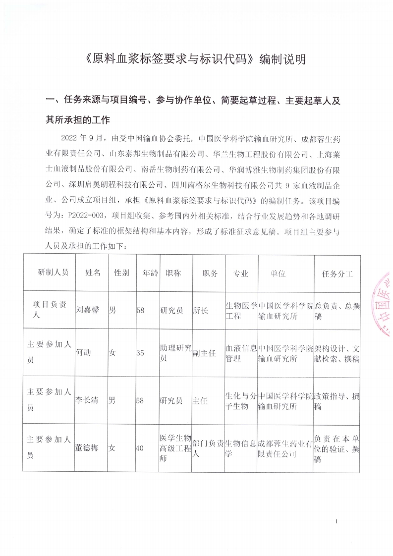 《原料血浆标签要求与标识代码》编制说明一、任务来源与项目编号、参与协作单位、简要起草过程、主要起草人及其所承担的工作2022年9月,由受中国输血协会委托,中国医学科学院输血研究所、成都蓉生药业有限责任公司、山东泰邦生物制品有限公司、华兰生物工程股份有限公司、上海莱士血液制品股份有限公司、南岳生物制药有限公司、华润博雅生物制药集团股份有限公司、深圳启奥朗程科技有限公司、四川南格尔生物科技有限公司共9家血液制品企业、公司成立项目组,承担《原料血浆标签要求与标识代码》的编制任务。该项日编号为:P2022-003,项日组收集、参考闲内外相关标准,结合行业发展趋势和各地调研结果,确定了标准的框架结构和基木内容,形成了标准征求意见稿。项日组主:要参与人员及承担的工作如下:研制人员姓名性别年龄职称职务专业单位任务分工项日负贵人刘嘉馨男58研究员所长生物医学中国医学科学院总负贵、总撰工程输血研究所稿主要参加人何助女35助理研究副主任血液信息中国医学科学院架构设计、义员员管理输血研究所献检索、撰稿主要参加人李长清男58研究员主任生化与分中国医学科学院政策指导、撰员子生物输血研究所稿主要参加人医学生物负责在本单萤德梅女40高级工榴部们负责生物信息成都蓉牛药业员人位的验证、撰师尝限责任公同稿