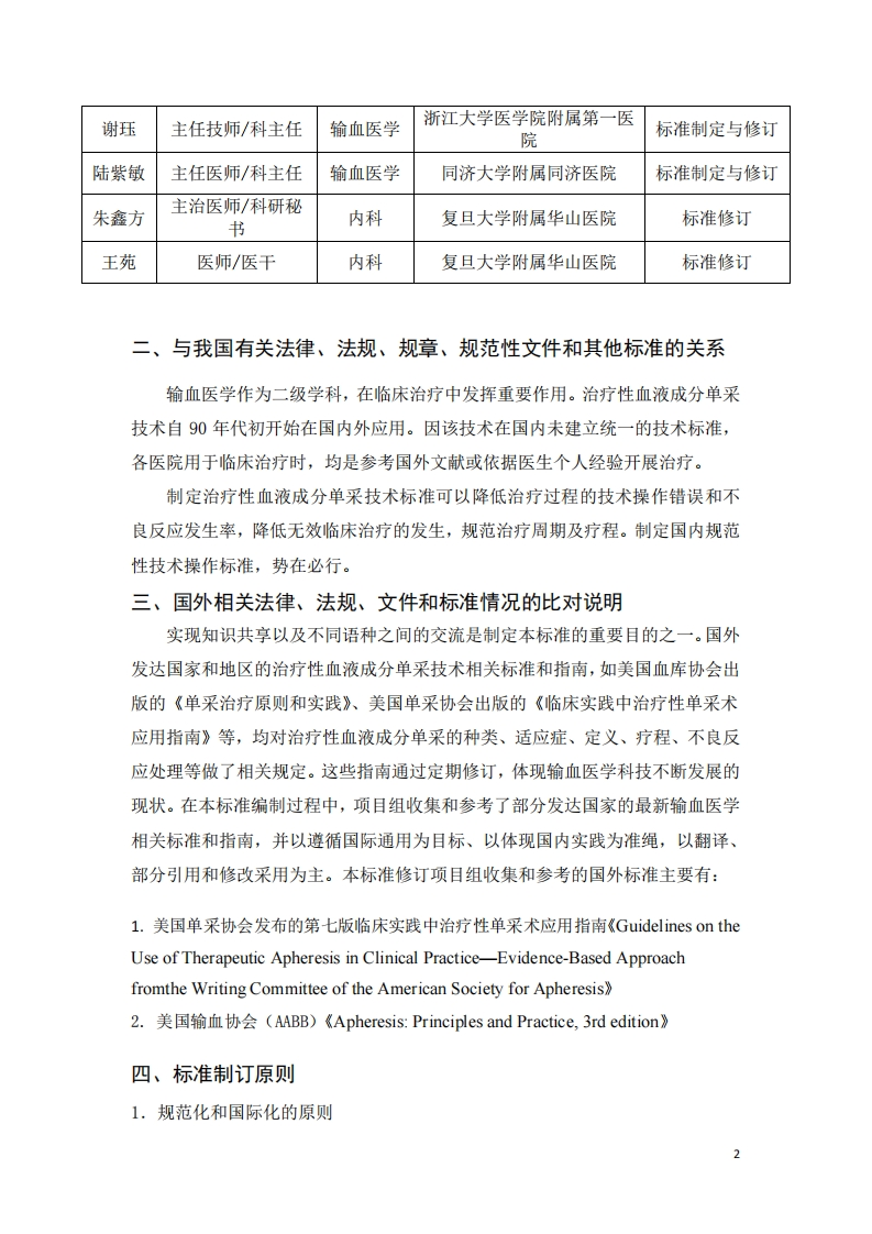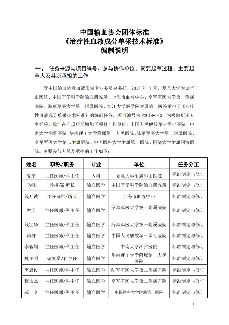 中国输血协会团体标准《治疗性血液成分单采技术标准》编制说明一、任务来源与项目编号、参与协作单位、简要起草过程、主要起草人及其所承担的工作受中国输血协会血液质量专业委员会委托,2018年4月,复旦大学附属华山医院、中国医学科学院输血研究所、上海市血液中心、空军军医大学第一附属医院、海军军医大学第一附属医院、浙江大学医学院附属第一医院承担了《治疗性血液成分单采技术标准》的编制任务,项目编号为P2018-013。为吸取更多专家经验,我们在立项后又增加了项目合作单位:中国人民解放军三零七医院、中南大学湘雅医院、华南理工大学附属第一人民医院、陆军军医大学第二附属医院、空军军医大学第二附属医院、中国医科大学附属第一医院、同济大学附属同济医院。主要参与人员及承担的工作如下:姓名职称/职务专业单位任务分工夏荣主任医师/科主任内科复旦大学附属华山医院标准制定与修订马峰教授/副所长输血医学中国医学科学院输血研究所标准制定与修订钱开诚主任医师/所长输血医学上海市血液中心标准制定与修订尹文主任医师/科主任输血医学空军军医大学第一附属医院标准制定与修订钱宝华主任医师/科主任输血医学海军军医大学第一附属医院标准制定与修订骆群主任医师/科主任输血医学中国人民解放军三零七医院标准制定与修订李碧娟主任医师/科主任输血医学中南大学湘雅医院标准制定与修订华南理工大学附属第一人民魏亚明研究员/科主任输血医学医院标准制定与修订李忠俊主任医师/科主任输血医学陆军军医大学第二附属医院标准制定与修订穆士杰主任医师/科主任输血医学空军军医大学第二附属医院标准制定与修订郝一文主任医师/科主任输血医学中国医科大学附属第一医院标准制定与修订