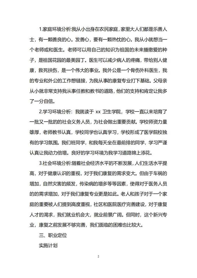 康复治疗技术职业规划范文康复治疗技术职业规划怎么写?下面为大家带来康复治疗技术职业规划范文,供大家参考。一、自我分析1职业兴趣老师,医生,作家,慈善事业2职业能力康复治疗技术专业,学习了人体发育学,言语治疗等专业知识,掌握基础手语,了解康复护理知识。能与老人和孩子良好的沟通,建立良好的医护关系。并能利用生活和书本及实践知识来指导工作。3.个人特质(或性格特征)我是一个简单,大方,重于实践,开拓进取,不断学习,勇于树立全新自我的人。做事认真负责,有耐心有恒心。开朗,乐观是我的主要特点,积极面对人生。自信的我让人觉得很强大,我坚强更有爱心。我乐于助人,有善心,有同情心。4职业价值观:尽最大的努力,付出自己最大的热血,需要我们帮助的人为其撑起信心就是最伟大的工作。5.胜任能力:一颗爱心+一颗恒心+一颗学习向上的心,我相信我有这个能力做好我的工作。自我分析总结我的性格和兴趣都很适合任教和医学道路,我更喜欢这工作。二、职业分析