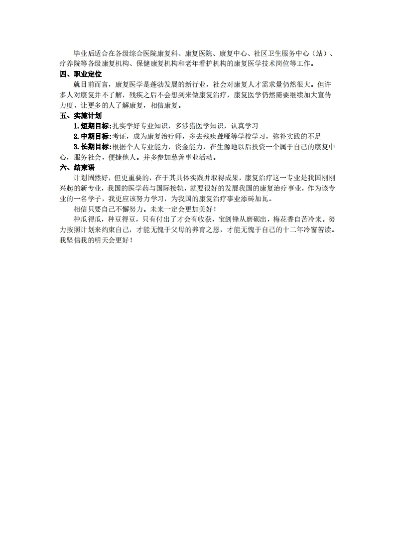 职业规划一、前言不少人都曾经这样问过自己:“人生之路到底该如何去走?”记得一位哲人这样说过:“走好每一步,这就是你的人生。”是啊,人生之路说长也长,因为它是你一生意义的诠释:人生之路说短也短,因为你生活过的每一天都是你的人生。每个人都在设计自己的人生,都在实现自己的梦想。有道是:“凡事预则立,不预则废”千真万确。对自己要做的或是将要做的事没有任何准备就是在为失败做准备!一直以来自己有一个习惯就是在做任何事情之前,都会考虑一下,有一个小小的计划,当然这并不是预不预的问题,只是我的一个习惯.在当前大学生所面对的就业压力十分的大,特别是我们大专生!我们如何在以后严峻的就业形式面前做的更好,在以后应聘时从众多的应聘者中脱影而出?我们以后到底做些什么?我们以后往那些方面发展?我们所以我们有必要提前规划我们的未来,为我们以后的发展做好规划,也就是我们的职业生涯设计!二、自我认识我是一个专科生,是家里最大的希望。成为有用之才是所有亲朋好友的希望。我性格外向、开朗、活泼,业余时间听音乐、外出散步,还有上网。喜欢看小说、杂志类的书籍,平时与人友好相处。喜欢创新,做事认真,但缺乏毅力、恒心,以致成绩不太理想,有时又多愁善感。但总感觉有时缺乏自信心。三、环境分析选择一个职业,也许就决定了自己未来的所有生活,因此需要对自己的理想职业有个清醒的认识,使自己向梦想越走越近。1.总体方面康复治疗是康复医学的重要内容之一,是使病、伤、残者康复的重要手段,常与药物治疗、手术疗法等临床治疗综合进行。随着生活水平的提高,“三高”越来越普遍,康复的价值就得到充分的体现:2.杜会方面:康复医学正在世界范围内兴起。在一些发达国家中尤为迅速它与预防医学,临床医学相并列,被人们誉为第三医学。在国内,康复医学虽然仍然是一门新兴学科,但其发展迅速,己成为一系统的医学专业,日益被人们所重视。3.专业方面:康复治疗技术专业是一门促进伤患者和残疾人身心功能康复的新的治疗学科,也是一门新的技术专业。它的目的是使人们能够尽可能地恢复日常生活、学习、工作和劳动,以及社会生活的能力,融入社会,改善生活质量。在20世纪下半叶及21世纪初,康复治疗技术这门新兴的技术专业和康复治疗师这种新的职业显示了强劲的发展势头和成长的活力,反映了医疗和康复市场对这门新的专业及人力资源的迫切需要。康复治疗技术专业的开设,正是顺应社会民众健康、审美的需要,满足人们对意外伤害、疾病所致的残疾、手术后的恢复等在治疗疾病、延年益寿等多方面的需求,有着广泛、深厚的社会基础,市场广阔。主干课程:人体解剖学、生理学、临床医学概要、康复医学概论、康复评定学、康复心理学、运动疗法学、作业疗法学、言语治疗学、针灸推拿学等。4、就业方向: