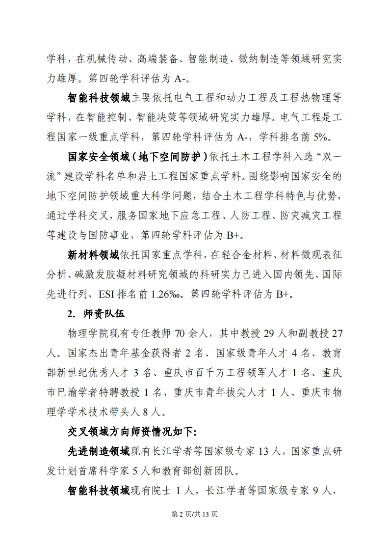 重庆大学强基计划物理学专业人才培养方案根据《教育部关于在部分高校开展基础学科招生改革试点工作的意见》(教学〔2020]1号)等文件要求,加强强基计划招生和培养的有效衔接,特制定培养方案如下。一、基本情况1.专业简介重庆大学物理学专业办学始于1929年所建立的理学院,它是重庆大学最早设立的三个学院之一。上世纪五十年代因院系调整整体迁出。1977年重新招收物理学本科生,2003年获凝聚态物理学博士学位授权点,2011年获物理学一级学科博士学位授权点,2013年获物理学博士后科研流动站。主要研究领域为理论物理、粒子物理和凝聚态物理。物理学是重庆市重点学科和ESI前1%学科。重庆大学强基计划物理学专业采用“3+1+2”(本-硕衔接)和“3+1+4”(本-博衔接)模式进行培养。其中,“3”是前三年主要以物理学科课程为主;“1”是第四年学生根据自己的兴趣和特长进入相关领域方向,完成本硕博衔接课程学习,“2”和“4”分别指进入硕士或博士研究生阶段,开展领域方向的科学研究工作。物理学专业主要面向物理学领域及物理相关学科领域进行交叉培养,相关学科基本情况如下:先进制造领域主要依托机械工程、仪器科学与技术两个重点第1页/共13页