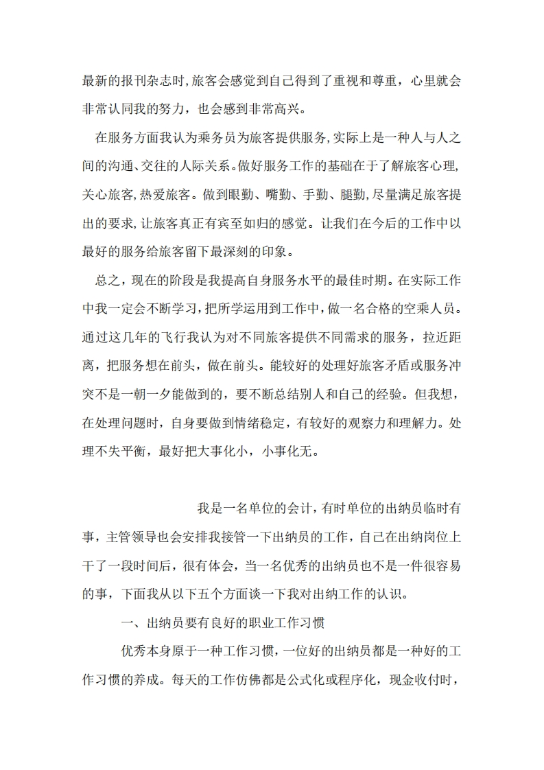 范文最新推荐2018年空乘人员工作心得感想这是一份特殊的职业,现实和梦想还是有差距的。我作为一名有5年工作经验的空乘,有很多的业务知识和生活常识需要我们巩固和学习:一旦出现紧急情况会应用到的特殊用语:飞机上如有乘客需要紧急医疗救助,那么你就要懂得的最起码的医疗方面的常识:不论飞国内还是国际航班都需要流利的中英文:机上服务用的各类饮料要熟悉,这些都需要平时的慢慢积累。当然对于我们乘务员来说最重要的就是飞机处于紧急情况时的用语,而且要说得相当的熟练。做为一名空乘也就代表着一个公司、一个地区乃至于一个国家。比如有乘客想了解一些当地的历史名胜、旅游景点、风土人情等,就需要我们对他们进行概括或详尽的介绍。飞国际航班的就要对两国的国情有一些大体的了解。所以乘务员的工作不仅仅是在飞机上面,更重要的是需要平常对生活的积累与细心观察以及对学习的加强,这样才会使平日里的工作得心应手。我想,如果一位旅客登机时,却看见空中乘务员正在滔滔不绝的谈论着一些不相干的事情,这时旅客会对我们的公司和员工留下一个什么样的印象呢?他可能在想:我们根本不重视旅客,对他们不屑一顾或者想我们公司的管理体制很松散等等一些对我们公司形象不利的看法。反之如果旅客登机看见整洁的客舱,舒适的座椅,随时待用的咖啡,1/10