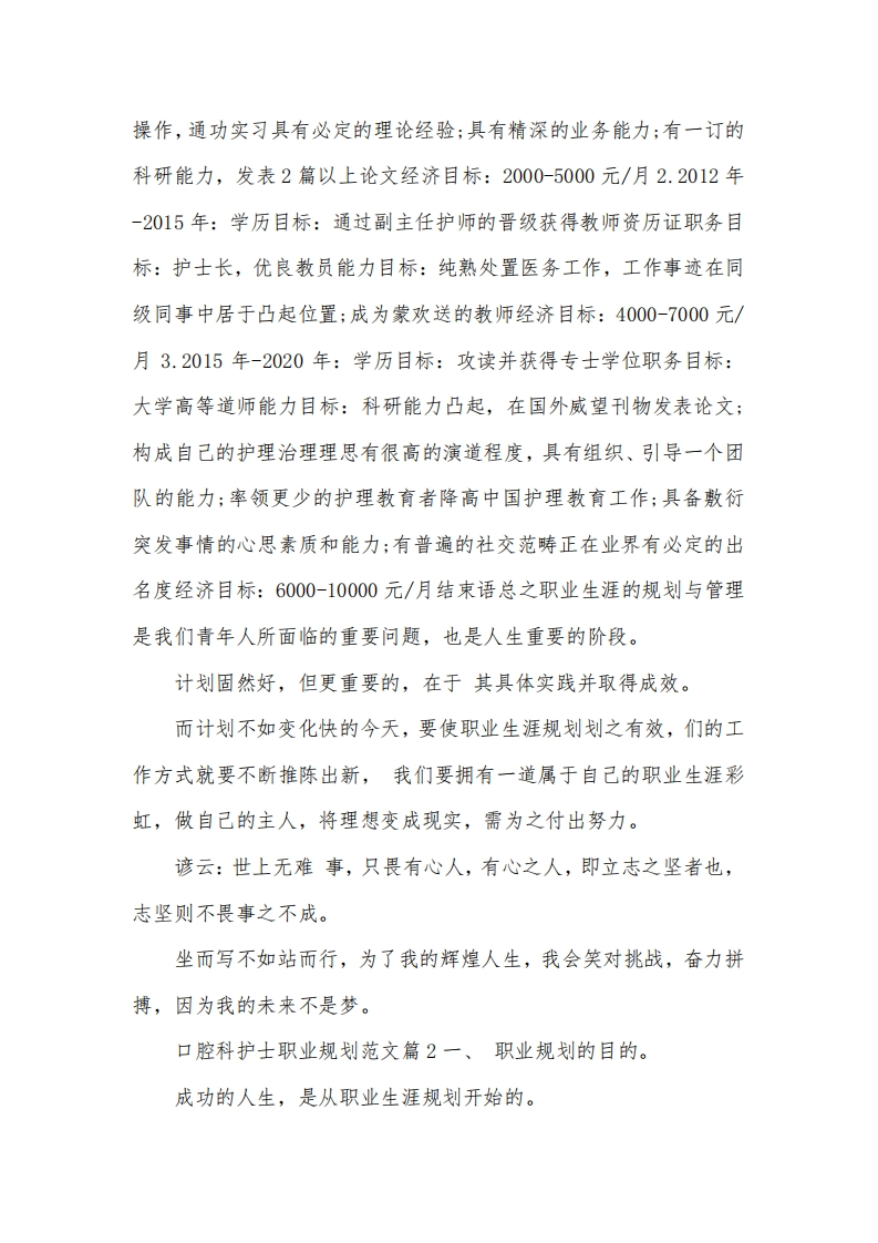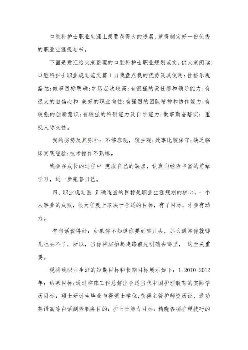 口腔科护士职业生涯上想要获得大的进展,就得制定好一份优秀的职业生涯规划书。下面是爱汇给大家整理的口腔科护士职业规划范文,供大家阅读!口腔科护士职业规划范文篇1自我盘点我的优势及其使用:性格乐观豁达;做事目标明确:学历层次较高;有很强的责任感和领导能力;有很大的自信心和美好的职业向往:有强烈的团队精神和协作能力:有较强的创新意识;有较强的科研能力及自学能力;做事勤奋踏实;重视人际交往。我的劣势及其弥补:不够客观,较主观:处事比较保守:缺乏临床实践经验:技术操作不熟练。我会在成长的过程中克服自己的缺点,认真向经验丰富的前辈学习,近一步完善自己。四、职业规划图正确适当的目标是职业生涯规划的核心,一个人事业的成败,很大程度上取决于合适的目标,有了目标,才会有动力。有句话说得好:如果你不知道你要到哪儿去,那么通常你就哪儿也去不了,所以,当你将脚抬起走路前先明确去哪里,这至关重要。现将我职业生涯的短期目标和长期目标展示如下:1.2010-2012年:结果目标:通过临床工作总解出合适当代中国护理教育的实际学历目标:硕士研讨生毕业与得硕士学位:获得主管护师资历证、通功英语高等白话测验职务目的:护士长能力目标:精晓各项护理技巧的