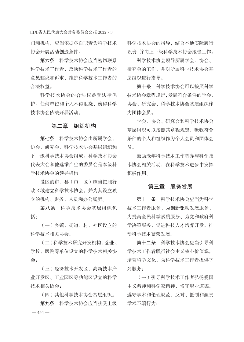 山东省人民代表大会常务委员会公报2022·3山东省科学技术协会条例1997年10月15日山东省第八届人民代表大会常务委员会第三十次会议通过2022年6月9日山东省第十三届人民代表大会常务委员会第三十五次会议修订设区的市和县(市、区)科学技术协会。目录第三条科学技术协会是科学技术工第一章总则作者的群众组织,是中国共产党领导下的第二章组织机构人民团体,是党和政府联系科学技术工作第三章服务发展者的桥梁和纽带,是推动科学技术事业发第四章保障措施展的重要力量,是国家创新体系的重要组第五章法律责任成部分。第六章附则第四条科学技术协会应当坚持独立自主、民主办会的原则,依照法律法规和第一章总则科学技术协会章程开展工作。第一条为了保障科学技术协会依法科学技术协会倡导尊重劳动、尊重知开展活动,发挥科学技术工作者的作用,识、尊重人才、尊重创造的风尚,弘扬科引导科学技术工作者践行社会主义核心价学家精神,推动科技伦理治理,鼓励科学值观,促进科技自立自强,推动高质量发探索和技术创新。展和现代化强省建设,根据《中华人民共第五条县级以上人民政府应当将科和国科学技术进步法》《中华人民共和国学技术协会工作纳人经济社会发展有关规科学技术普及法》等法律、行政法规,结划,制定促进科学技术协会发展的政策措合本省实际,制定本条例。施,统筹解决科学技术协会发展中的突出第二条本条例适用于本省行政区域问题。内科学技术协会的组织建设、工作开展以县级以上人民政府发展改革、教育、及相关服务保障等活动。科学技术、民政、财政、人力资源社会保本条例所称科学技术协会,包括省、障、外事以及国有资产监督管理等有关部—453—