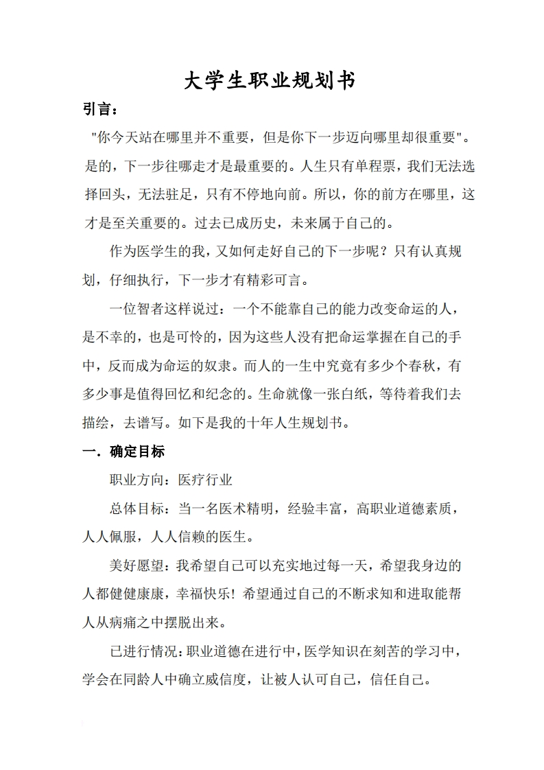 临床医学专业大学生职业生涯规划书348072@abc4个月前发布关注私信0.25MB6页040临床医学专业大学生职业生涯规划书此内容为付费资源,请付费后查看¥11¥20黄金会员免费钻石会员免费立即购买您当前未登录!建议登陆后购买,可保存购买订单付费资源 第1页 / 共6页 第2页 / 共6页 试读已结束,还剩4页,您可下载完整版后进行离线阅读 THE END活动策划 文本预览 遵义医学院医学与科技学院医学影像学专业大学生职业生涯规划书姓名:董梦影班级:学号:2013年3月 查看更多 收起部分 喜欢就支持一下吧收藏