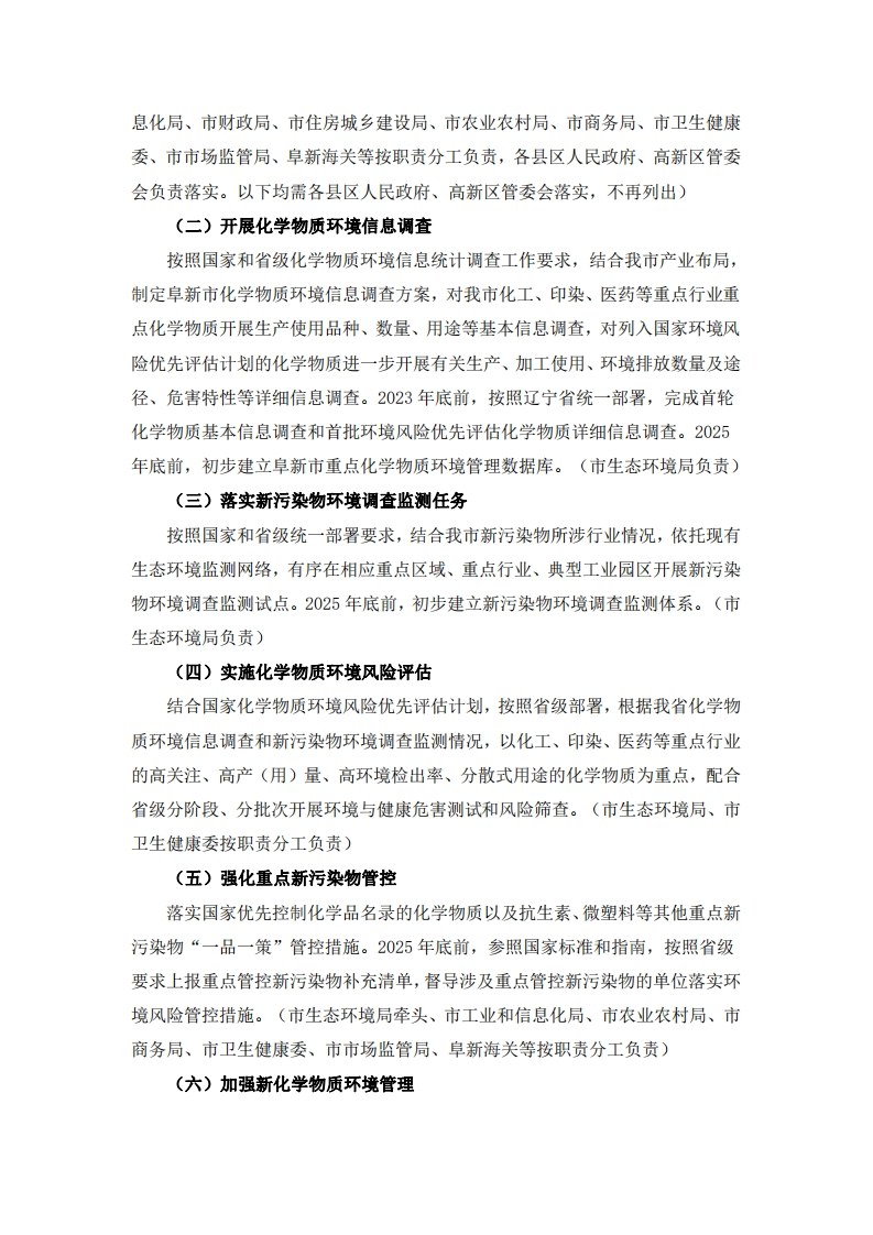 阜新市新污染物治理工作方案(征求意见稿)为贯彻落实《国务院办公厅关于印发新污染物治理行动方案的通知》(国办发〔2022)15号)、《辽宁省人民政府办公厅关于印发辽宁省新污染物治理工作方案的通知》(辽政办〔2023)18号)要求,统筹推进我市新污染物治理工作,提升有毒有害化学物质环境风险管控能力,切实保障生态环境安全和人民群众身体健康,结合我市实际,制定本方案。一、指导思想以习近平新时代中国特色社会主义思想为指导,全面贯彻党的二十大精神,深入贯彻习近平生态文明思想,以有效防范新污染物环境与健康风险为核心,以精准治污、科学治污、依法治污为工作方针,遵循全生命周期环境风险管理理念,强化制度保障,加强科技和财政支撑,协同推进新污染物调查监测、筛查评估、管控治理各项工作,健全新污染物治理体系,促进以更高标准打好污染防治攻坚战,提升美丽阜新、健康阜新建设水平。二、主要目标围绕典型工业园区、饮用水源地、农产品产地、大凌河流域、辽河流域等重点区域和化工、印染、医药等重点行业,实施调查评估、分类治理,统筹推进新污染物环境风险管理。到2025年,基本摸清我市重点区域、重点行业化学物质环境信息,有效落实重点管控新污染物禁止、限制、限排措施,基本形成新污染物调查、监测、筛查、评估能力,按照省级有关部门要求完成一批新污染物环境调查监测、风险评估和环境治理试点。有毒有害化学物质环境风险管理机制逐步建立健全,全面提升新污染物治理能力。三、重点任务(一)建立健全新污染物治理管理机制建立市生态环境局牵头,市发展改革委、市科技局、市工业和信息化局等部门参加的新污染物治理跨部门协调机制,统筹推进新污染物治理工作,协调解决新污染物治理过程中的重大问题。加强部门联合调查、联合执法、信息共享。按照市级负总责、县区落实的原则,完善新污染物治理管理机制,全面落实新污染物治理属地责任。〔市生态环境局牵头,市发展改革委、市科技局、市工业和信