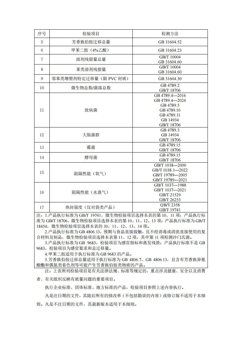 济南市复合膜袋产品质量监督抽查实施细则(2025年版)1抽样1.1抽样方法以随机抽样的方式在被抽样生产者的待销产品中抽取。1.2抽样基数抽查样品基数满足抽样数量即可。1.3抽样数量膜类产品:每批次产品抽取样品3卷,将每卷膜外层除去2m,每卷膜各抽取2.5m2×2,平均分为2份,其中1份作为检验样品,1份作为备用样品:对于执行标准为GB/T18706的液体食品保鲜包装用纸基复合材料产品,GBT19741的液体食品包装用塑料复合膜类产品,GB4806.13中的预期与食品直接接触、且不经消毒或清洗直接使用的复合膜类产品应从每卷膜各抽取2.5m2×3,平均分为3份,其中1份作为其他检验用样品,1份作为微生物检验用样品,1份作为备用样品。袋类产品:每批次产品抽取3箱,每箱中各抽取30个×2(袋规格应不小于15cm×15cm),平均分为2份,其中30个×3作为检验样品,30个×3作为备用样品:对于执行标准为GBT18706的液体食品保鲜包装用纸基复合材料产品,GBT18454的液体食品无菌包装用复合袋类产品,GBT19741的液体食品包装用塑料复合袋类产品,GB4806.13中的预期与食品直接接触、且不经消毒或清洗直接使用的复合袋类产品应分别从3箱中各抽取30个×3(袋规格应不小于15cm×15cm),,平均分为3份,其中30个×3作为其他检验用样品,30个×3作为微生物检验用样品,30个×3作为备用样品。样品规格较大或较小时,可根据检验需求调整样品数量。2检验项目及检测方法表1复合膜袋产品检验项目序号检验项目检测方法GB96831感官指标/感官要求GB4806.7-2016GB4806.7-2023蒸发残渣/总迁移量GB31604.82GB9683GB31604.2GB96833高锰酸钾消耗量GB4806.7-2016GB4806.7-2023GB31604.9重金属(以Pb计)GB9683GB4806.7-2016GB4806.7-2023