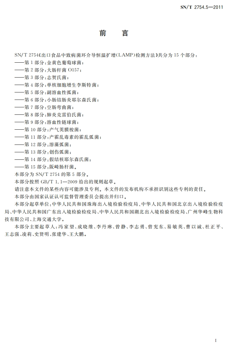 SN中华人民共和国出入境检验检疫行业标准SN/T2754.5-2011出口食品中致病菌环介导恒温扩增(LAMP)检测方法第5部分:副溶血性弧菌Loop-mediated isothermal amplification detection method for pathogensin export food-Part 5:Vibrio parahaemolyticus2011-02-25发布2011-07-01实施中华人民共和国国家质量监督检验检疫总局发布