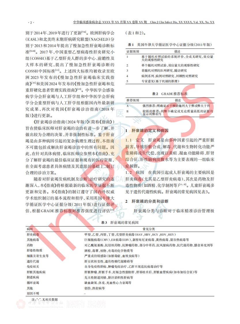 中华临床感垫病杂志XXXX年XX月第XX卷第XX期Chin J Clin Infeet Dis.XX XXXX.Val.XX.No.XX1·指南与共识·肝衰竭诊治指南(2024年版)中华医学会感染病学分会肝衰竭与人工肝学组中华医学会肝病学分会重型肝病与人工肝学组道信作者:李兰娟,浙江大学医学院附属第一医院传染病重症诊治全国重点实验室,杭州310003,Email:lji@zju.edu.cn;韩海,南开大学人民医院(天津市人民医院),天津300121,Email:hantaomd@126.com【摘要】肝衰竭是临床常见的严重肝病症候群,病死率极高。多年来,各国学者对肝衰竭的定义、病因、分类、分型、诊断和治疗、预后等问题不断进行探索。根据国内外最新研究成果,中华医学会感染病学分会肝衰竭与人工肝学组和中华医学会肝病学分会重型肝病与人工肝学组在我国《肝衰竭诊治指南(2018年版)》的基础上对指南进行了全面更新,以指导和规范肝衰竭的临床诊疗。【关键词】肝功能衰竭;肝,人工;诊断;治疗;指南D0l:10.3760/cma.j.issn.1674-2397.2024.05.001Guideline for diagnosis and treatment of liver failure (2024 version)Liver Failure and Artificial Liver Group,Chinese Society of Infectious Diseases,Chinese Medical Association,Severe Liver Disease and Artificial Liver Group,Chinese Society of Hepatology.Chinese Medical AssociationCorresponding author:Li Lanjuan,Email:lili@ju.edu.en.State Key Laboratory for Diagnosis and Treat-ment of Infectious Diseases.the First Affliated Hospital.Zhejiang University School of Medicine.Hangzhou310003.ChinaCo-corresponding author:Han Tao,Email:hantaomd@126.com,Tianjin Union Medical Center,TianjinMedical University,Tianin Union Medical Center affiliated to Nankai University,Tianjin 300121,China[Abstract]Liver failure is a severe clinical syndrome of liver disease with an extremely highmortality rate.Over the years,scholars worldwide have continuously investigated various aspects of liverfailure,including its definition,etiology,classification,types,diagnosis and treatment,and prognosticassessment.Based on the latest advances in research,Liver Failure and Artificial Liver Group,ChineseSociety of Infectious Diseases,Chinese Medical Association along with Severe Liver Disease and ArtificialLiver Group,Chinese Society of Hepatology,Chinese Medical Association have conducted a comprehensiveupdate on the Guidelines for Diagnosis and Treatment of Liver Failure (2018 version).This update aims tooffers standardized protocols and evidence-based recommendations to guide the management of liver failurein clinical settings.【Key words】Liver failure:Artificial liver;Diagnosis:Treatment;GuidelineD0L:10.3760ema.i.issn.1674-2397.2024.05.001肝衰竭是临床常见的严重肝病症候群,病死率第一部《肝衰竭诊疗指南》,从定义、诱因、分类、极高。多年来,各国学者对肝衰竭的定义、病因、诊断和治疗等方面对我国肝衰竭进行了系统而精分类、分型、诊断和治疗、预后等问题不断进行探要的阐述,既与国际接轨,又独具中国特色,诊断分索。2005年,美国肝病学会(AASLD)发布了《急性型突出了实用性,指导和规范了我国肝衰竭的临床肝衰竭处理》21的建议书。2006年10月,中华医学诊疗,并于2012年、2018年进行了2次修订41。亚会感染病学分会肝衰竭与人工肝学组和中华医学太肝脏研究协会(APASL)于2009年首次提出针对会肝病学分会重型肝病与人工肝学组制订了我国慢加急性肝衰竭定义和诊断标准的专家共识,分引用格式:中华医学会感染病学分会肝衰竭与人工肝学组,中华医学会肝病学分会重型肝病与人工肝学组肝衰竭诊治指南(2024年版)[J】.中华临床感染病杂志,XXXX,XX(XX):1-19.D0:10.3760emm.j.isn.1674-2397.2024.05.001.