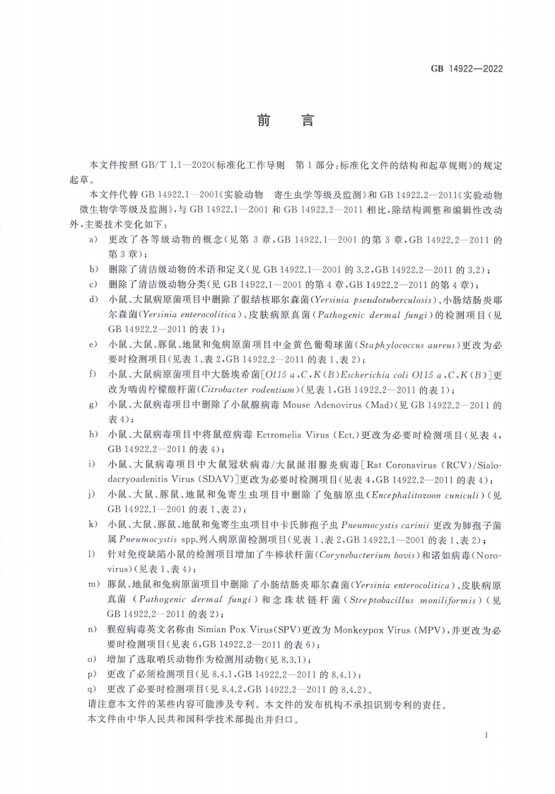 1CS65.020.30CCS B 44中华人民共和国国家标准GB14922-2022代替GB14922.1一2001,GB14922.2-2011实验动物微生物、寄生虫学等级及监测Laboratory animal-Microbiological and parasitical standards and monitoring2022-12-29发布2023-07-01实施国家市场监督管理总局国家标准化管理委员会发布