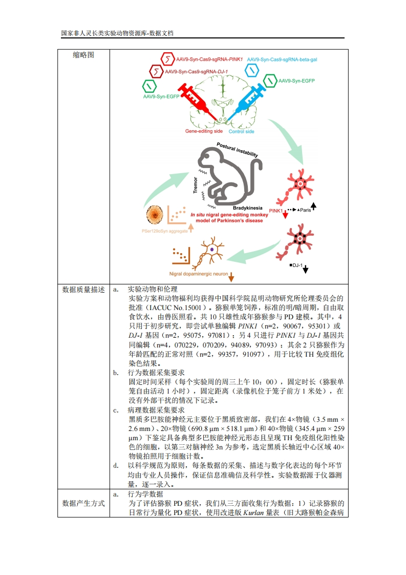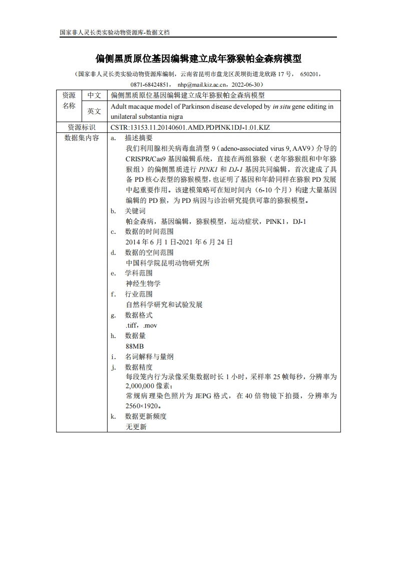 国家非人灵长类实验动物资源库-数据文档偏侧黑质原位基因编辑建立成年猕猴帕金森病模型(国家非人灵长类实验动物资源库编制,云南省昆明市盘龙区茨坝街道龙欣路17号,650201,0871-68424851,nhp@mail.kiz.ac.cn,2022-06-30)资源中文偏侧黑质原位基因编辑建立成年猕猴帕金森病模型名称英文Adult macaque model of Parkinson disease developed by in situ gene editing inunilateral substantia nigra资源标识CSTR:13153.11.20140601.AMD.PDPINK1DJ-1.01.K☑数据集内容a.描述摘要我们利用腺相关病毒血清型9(adeno-associated virus9,AAV9)介导的CRISPR/Cs9基因编辑系统,直接在两组猕猴(老年猕猴组和中年猕猴组)的偏侧黑质进行PWK!和DJI基因共同编辑,首次建成了具备PD核心表型的猕猴模型,也证明了基因和年龄同样在猕猴PD发展中起重要作用。该建模策略可在短时间内(6-10个月)构建大量基因编辑的PD猴,为PD病因与诊治研究提供可靠的猕猴模型。b.关键词帕金森病,基因编辑,猕猴模型,运动症状,PNK1,DJ1C.数据的时间范围2014年6月1日-2021年6月24日数据的空间范围中国科学院昆明动物研究所e.学科范围神经生物学f.行业范围自然科学研究和试验发展$数据格式.tiff,movh.数据量88MBi.名词解释与量纲i.数据精度每段笼内行为录像采集数据时长1小时,采样率25帧每秒,分辨率为2,000,000像素:常规病理染色照片为EPG格式,在40倍物镜下拍摄,分辨率为2560x1920。数据更新频度无更新