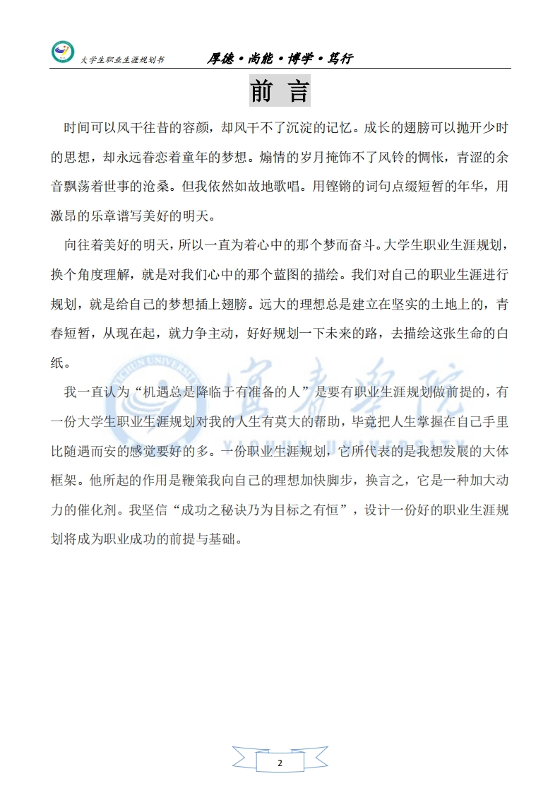 美术生职业生涯规划书348072@abc7个月前发布关注私信0.66MB13页024美术生职业生涯规划书此内容为付费资源,请付费后查看¥11¥20黄金会员免费钻石会员免费立即购买您当前未登录!建议登陆后购买,可保存购买订单付费资源 第1页 / 共13页 第2页 / 共13页 试读已结束,还剩11页,您可下载完整版后进行离线阅读 THE END活动策划 文本预览 大学生职业生涯规划书厚德·尚能·博学·笃行个人简介姓名:*性别:*年龄:*籍贯:****所在学校:**班级及专业:***学号:1155***QQ号:*一**E-mai1:*******@163.C0m********@qq.C0m乡院个人微博:t.qg.C0m/*****个人空间:user.qzone.qq.com/I T Y欲望以提升热忱,毅力以磨平高山。一一座右铭>,☒ 查看更多 收起部分 喜欢就支持一下吧收藏