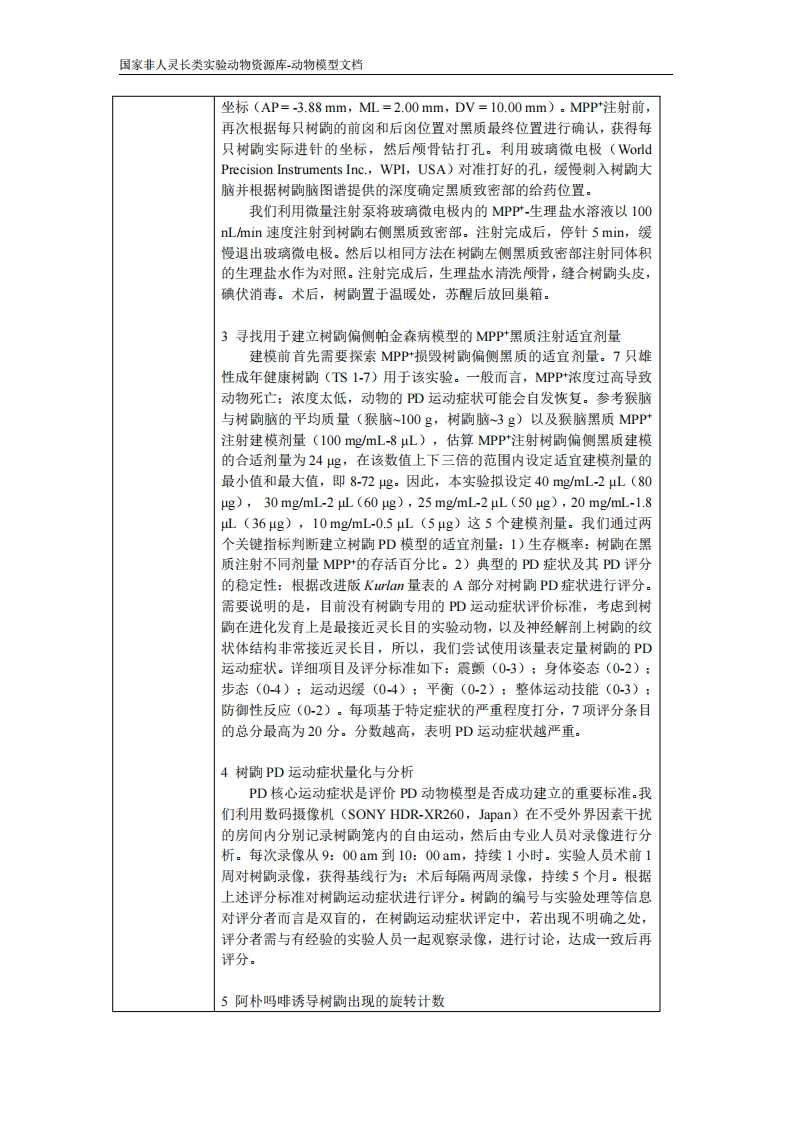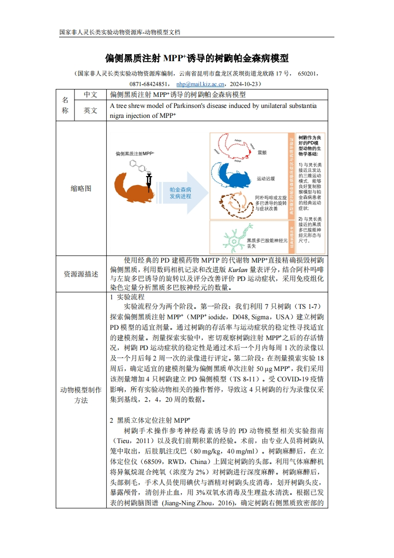 国家非人灵长类实验动物资源库-动物模型文档偏侧黑质注射MPP+诱导的树胸帕金森病棋型(国家非人灵长类实验动物资源库编制,云南省昆明市盘龙区茨坝街道龙欣路17号,650201,0871-68424851,nhp@mail.kiz.ac.cn,2024-10-23)中文偏侧黑质注射MPP+诱导的树齣帕金森病模型名称英文A tree shrew model of Parkinson's disease induced by unilateral substantianigra injection of MPP+树的作为良好的PD模型动物的生编侧黑质注射MPP物学基础:1)与灵长类接近且发达远动迟缓的三维远动模式,能够缩略图帕金森病良好复制猕欢模型与怕发病进程阿朴吗啡或左旋金森病患者多巴诱导的旋转的经典运动与症状改善症状:2)与灵长类接近的黑质多巴胺能神经元形态与黑质多巴胺能神经元尺寸丢失使用经典的PD建模药物MPTP的代谢物MPP+直接精确损毁树嗣资源源描述偏侧黑质,利用数码相机记录和改进版Klam量表评分,结合阿朴吗啡与左旋多巴诱导的旋转以及评分改善评价PD运动症状,采用免疫组化染色定量分析黑质多巴胺神经元的数量。1实验流程实验流程分为两个阶段。第一阶段:我们利用7只树鼩(TS1-7)探索偏侧黑质注射MPp*(MPp*iodide,D048,Sigma,USA)建立树齣PD模型的适宜剂量。通过树鼩的存活率与运动症状的稳定性寻找适宜的建模剂量。剂量探索实验中,密切观察树齣注射MPP之后的存活情况,树齣PD运动症状的稳定性是通过术后一个月内每周1次的录像以及一个月后每2周一次的录像进行评定。第二阶段:在剂量摸索实验18周后,确定适宜的建模剂量为偏侧黑质单次注射50 Hg MPP*,我们采用该剂量增加4只树鼩建立PD偏侧模型(TS8-11)。受COVID-19疫情动物模型制作影响,所有实验动物相关的操作暂停,导致这4只树齣的行为录像仅采方法集到基线,2,4,20周的数据。2黑质立体定位注射MPP树鼩手术操作参考神经毒素诱导的PD动物模型相关实验指南(Tiu,2011)以及我们前期积累的经验。术前,由专业人员将树韵从笼中取出,后肢肌注戊巴(80mgkg,40mgml)。树胸麻醉后,在立体定位仪(68509,RWD,Chia)上固定树齣的头部。利用气体麻醉机将异氟烷混合纯氧(浓度为2%)对树駒进行深度麻醉。树齣麻醉后,头部剃毛,手术人员使用碘伏与酒精对树鼩头皮消毒,划开树齣头皮,暴露颅骨,清创并止血,用3%双氧水消毒及生理盐水清洗。根据己发表的树齣脑图谱(Jiang-.Ning Zhou,2016),确定树鼩右侧黑质致密部的