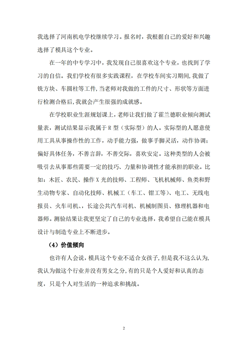 梦想启航一一做一名模具技师一.个人分析(1)个性特征我是一个性格内向,不擅长说话的女孩儿,但我好奇心强、喜欢思考,尤其喜欢做数字推理题、看侦探小说:我做事认真、责任心强,相信“有志者事竟成”;我踏实稳重、注重细节,把自己的生活和学习规划的有条不紊。(2)兴趣爱好受传统教育的我成长在现代社会里,因而我身上既有传统的优势,也不乏现代的追求创新。我对文学有一定的热爱,喜欢看《读者》、《青年文摘》、《特别关注》之类的杂志:我喜欢运动,打羽毛球、乒乓球、跳绳都是我擅长的项目;和其他女孩不同的是,我还喜欢摆弄一些玩具,经常把家里的一些东西拆了又装,装了又拆,反复摆弄。我也时不时修理一些家里的日常用品具,如果自己的自行车哪个零件丢了,我就找一个装上:家里新买的电扇是由我安装的,如果需要清洗也是由我进行拆装,这些对我来说都是很有趣的事。(3)专业倾向高中的应试教育,也许并不适合每一个人。高二时我退学了,我认为自己并不适合走那条路。退学之后家人不同意让我再继续念下去,但是我很不甘心,我有很强的学习愿望和能力,我希望能找到适合自己的学业道路。于是,在家人的反对下我来到郑州的小姨家,小姨帮