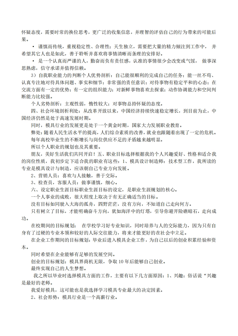 模具专业大学生职业生涯规划书本文为一位模具专业大学生制定的大学期间和人生的职业生涯规划书。包括确定志向、自我剖析、自我优势和劣势分析、职业目标的选择与确定和实施步骤与方法等。针对模具专业就业前景,较为翔实,值得借鉴。生涯设计公益网专题组。大学生职业生涯规划一、前言近年来随着大学校园的扩招,大学生就业压力越来越重,其中不少毕业生就业前迷茫,就业后频繁跳槽,就业权益受侵害事件也时有发生,所以就业前做一份合理的职业生涯规划书是重要的,更是必要的。职业是参与社会分工,利用专门的知识和技能,创造物质财富,精神财富,获得合理报酬,满足物质生活,精神生活的工作。“生是指活着的意思,“涯泛指边际。“生涯是指人的一生,或指个人一生的发展过程,也指一个人一生中所扮演的角色与职位。由此看来,为了我们的一生我们应该有一个明确的规划。我是一名极其热爱生活,富于追逐梦想的大学生,对未来充满了无限的憧憬,然而面对现实却有太多的茫然,尤其是当今社会的竞争是科技的竞争,更是人才的竞争,竞争就像前进道路上的陷阱,如果我们不做好充分的准备,必将被其所连累,还有被推毁的危险,所以提前规划自己的生涯是比较明智的。如果我们不能依靠自己的能力来改变我们的命运,那么我们的人生将是失败的,想想看,我们的一生毕竞是有限的,又有多少事是值得回忆和纪念的呢?我们未来的生活就像一座沉睡了已久的宝藏等待着我们去挖掘,其实规划就是我们进军宝藏的最佳手段,能够达到事半功倍的效果。朋友们,人没有点滴量的积累,难成大功业:没有勤勤恳恳的刻苦钻研,难有震撼人心的成功喜悦。我们不能等花已调谢才来珍惜,也不能等机会远去才来痛心,更不能等已经失败才来懊悔。所以提前为自己的将来做好规划,给自己一个明确的定位,为职业生涯做一个系统而全面的梳理,把命运牢牢地控制在自己手是我们人生中一个无悔的创举!努力就有收获,付出就有回报。激-情成就未来,规划实现梦想。二、确定志向职业理想:作为学模具的,最大的志向就是走向企业的队伍当中去。结合自身独有的特点,理想是进入模具行业,从低层做起,最终实现自己的管理梦。人生理想:最大程度的实现自我价值,最终成为在社会上具有一定影响力的高素质复合性人才。三、自我剖析1)兴趣爱好:看书,喜欢看小说、散文,尤其爱看杂志类的书籍,听音乐,交友,聊天,还有上网,喜欢社交、娱乐、2)人格描述:·看问题有很强的批判性,通常持