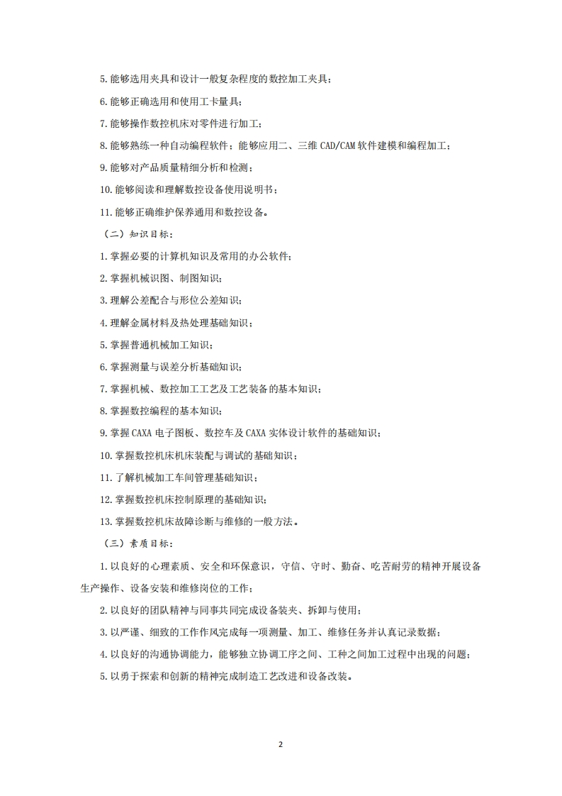 数控技术应用中专班人才培养方案一、专业名称数控技术应用二、专业代码051400三、入学要求初中毕业生或具有同等学历者。四、学习年限三年五、培养目标本专业培养与我国现代化建设要求相适应,德、智、体、美全面发展的,具有与本专业相适应的文化水平、良好的职业道德与产业文化素养,掌握本专业的专业知识和技能,能够从事数控设备的操作与编程、产品质量检验、数控设备的管理维护、营销等工作的德智体美劳全面发展的的高素质劳动者和技能型人才。六、就业方向、岗位及职业资格证书表6-1就业方向、岗位及职业资格证书就业方向就业岗位职业资格证书通用机床操作工机械制造初次就业岗位数控机床操作工中级证书数控机床操作工生产企业发展就业岗位技术员、质检员七、人才规格本专业所培养的人才应具有以下知识、能力与素质目标:(一)能力目标:1.能够识读中等及复杂程度产品的零件图和装配图:2.能绘制中等及复杂程度产品的零件图和装配图:3.能够编制和实施通用机床、数控机床加工工艺:4.能够编制数控加工程序:1