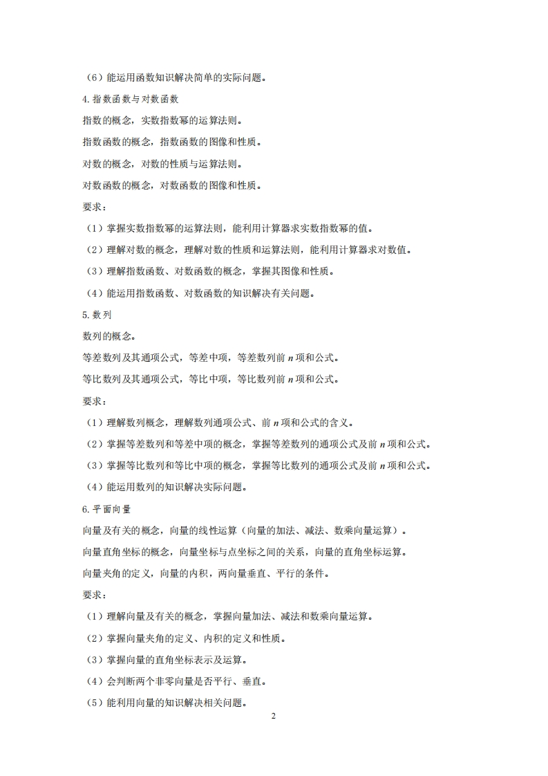 数学考试标准一、考试范围和要求(一)代数1.集合集合的概念,集合的表示方法,集合之间的关系,集合的基本运算,充分、必要条件。要求:(1)理解集合的概念,掌握集合的表示方法,会判断元素与集合、集合与集合之间的关系,掌握集合的交、并、补运算。(2)能正确地区分充分、必要、充要条件。(3)理解符号e、、=、C、2,g、2,、、nU、CA仁,片的含义。2.不等式实数的大小,不等式的性质,区间,含有绝对值的不等式的解法,一元二次不等式的解法。要求:(1)理解不等式的性质,会用作差比较法比较两个实数(代数式)的大小。(2)理解区间的概念。(3)会解形如r+b≥c或ar+b