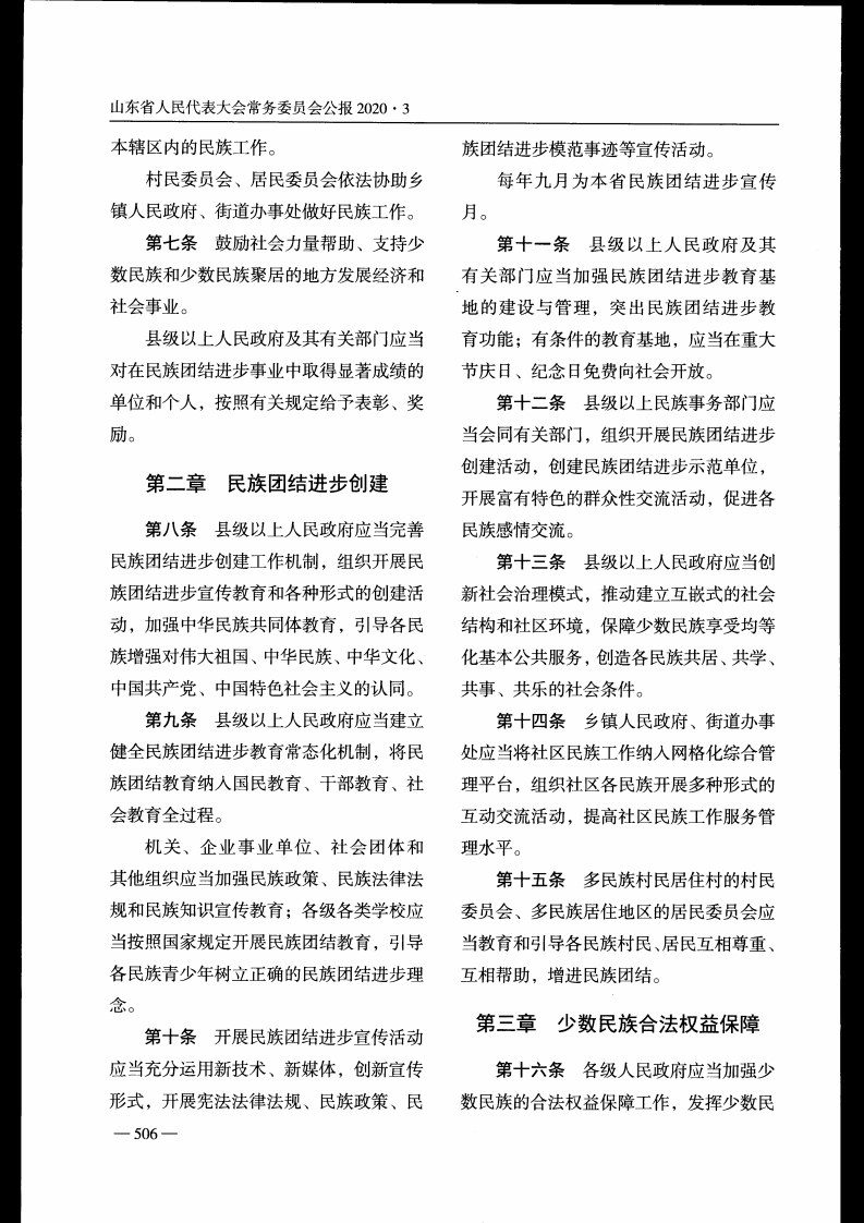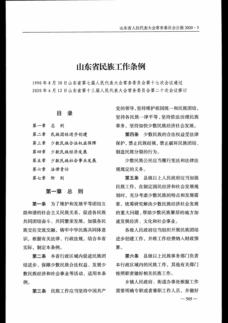 山东省人民代表大会常务委员会公报2020·3山东省民族工作条例1990年8月30日山东省第七届人民代表大会常务委员会第十七次会议通过2020年6月12日山东省第十三届人民代表大会常务委员会第二十次会议修订党的领导,坚持维护祖国统一和民族团结,目录坚持各民族一律平等,坚持依法治理民族第一章总则事务,坚持加快少数民族经济社会发展。第二章民族团结进步创建第四条少数民族的合法权益受法律第三章少数民族合法权益保障保护,禁止民族歧视,禁止破坏民族团结、第四章少数民族经济发展制造民族分裂的行为。第五章少数民族社会事业发展少数民族公民应当履行宪法和法律法第六章法律责任规规定的义务。第七章附则第五条县级以上人民政府应当加强民族工作,在制定国民经济和社会发展规第一章总则划时,充分考虑少数民族的特点和发展需第一条为了维护和发展平等团结互要,统筹研究解决少数民族经济社会发展助和谐的社会主义民族关系,促进各民族的重大问题,帮助少数民族聚居的地方加共同团结奋斗、共同繁荣发展,加强各民速发展经济、文化和社会事业。族交往交流交融,铸牢中华民族共同体意各级人民政府应当组织开展民族团结识,根据有关法律、行政法规,结合本省进步创建工作,并将工作经费纳入财政预实际,制定本条例。算。第二条本省行政区域内促进民族团第六条县级以上民族事务部门负责结进步、保障少数民族合法权益、发展少本行政区域内的民族工作,其他有关部门数民族经济和社会事业等活动,适用本条按照职责做好相关民族工作。例。乡镇人民政府、街道办事处根据工作第三条民族工作应当坚持中国共产需要明确专职或者兼职工作人员,并做好-505