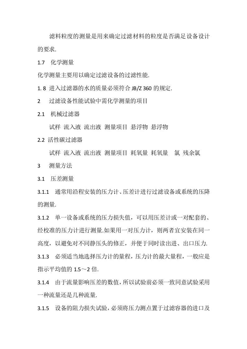 水处理设备过滤设备技术标准1试验程序1.1在试验中,主要用压差、流量、滤料体积、滤料粒度的测量确定过滤设备的水力特性1.2压差测量1.2.1压差测量,可以反映滤料床层的污染程度.过滤器反洗运行的效果,一般可通过测量反洗前后滤料床层的压降予以确定.1.2.2压差测量应用第6章中所列的测量装置,1.3流量测量1.3.1流量的测量可以确定设备的出力,也可用来确定反洗、正洗及过滤器各部件的流体流速,1.3.2流量测量应用第6章中所列的测量装置,1.4温度测量温度测量是为了确保过滤器在设计工况下运行.温度测量的方法及仪表按第6章的规定1.5滤料装入时层高的测量1.5.1滤料层高的测量,是用来确认过滤设备中各种规格滤料的层高1.5.2在进行滤料体积的测量时应考虑容器封头的体积及内部分配器所占的体积.1.6滤料装入时粒度的测量