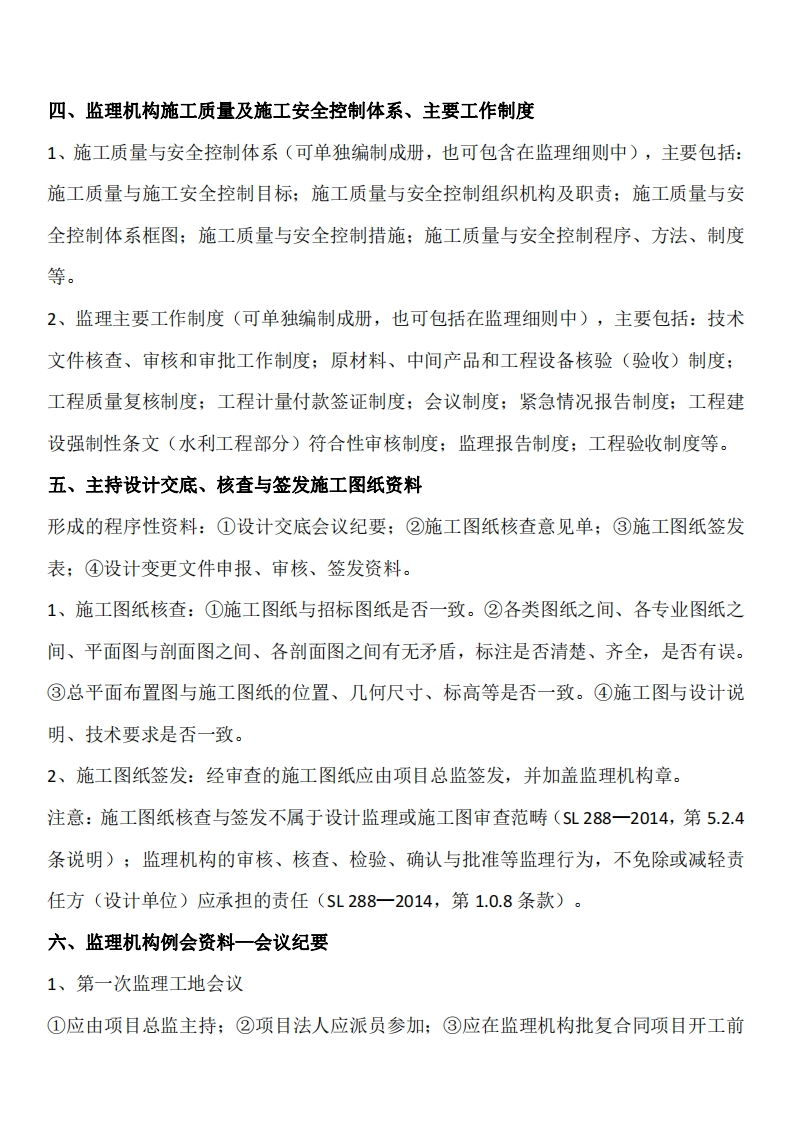 水利工程监理单位程序性资料归档整编主要内容及要求一、监理单位现场监理机构组建文件1、总监理工程师任命、监理机构组建(文件应明确主要监理人员)及监理机构印章启用文件。以上文件应由合同签订单位以红头文件送达项目法人核备。2、监理机构应将主要监理人员的姓名、监理业务分工和授权范围报送项目法人,并书面通知施工单位。3、现场监理机构人员如需更换,应事先征得(书面)发包人同意,并向水行政建设主管部门和质量监督机构办理核备手续。4、程序性资料落款:为现场组织机构,施工单位:××公司××项目部;监理单位:X×公司××项目监理部。程序性资料应签字、盖章。二、监理规划编制的主要内容由项目总监组织编制,并报监理单位技术负责人批准后实施。主要包括十三个章节:总则:工程质量控制:工程进度控制:工程资金控制:施工安全及文明施工管理:合同管理的其他工作:协调:工程质量评定及验收监理工作:缺陷责任期监理工作;信息管理;监理设施:监理细则编制计划:其他。三、监理实施细则编制的主要内容由相关监理工程师组织专业监理人员编制,并报总监理工程师批准。主要包括四个方面的内容:1、专业工程监理实施细则:2、专业工作监理实施细则:3、安全监理实施细则:4、原材料、中间产品和工程设备进场核验及验收监理实施细则。