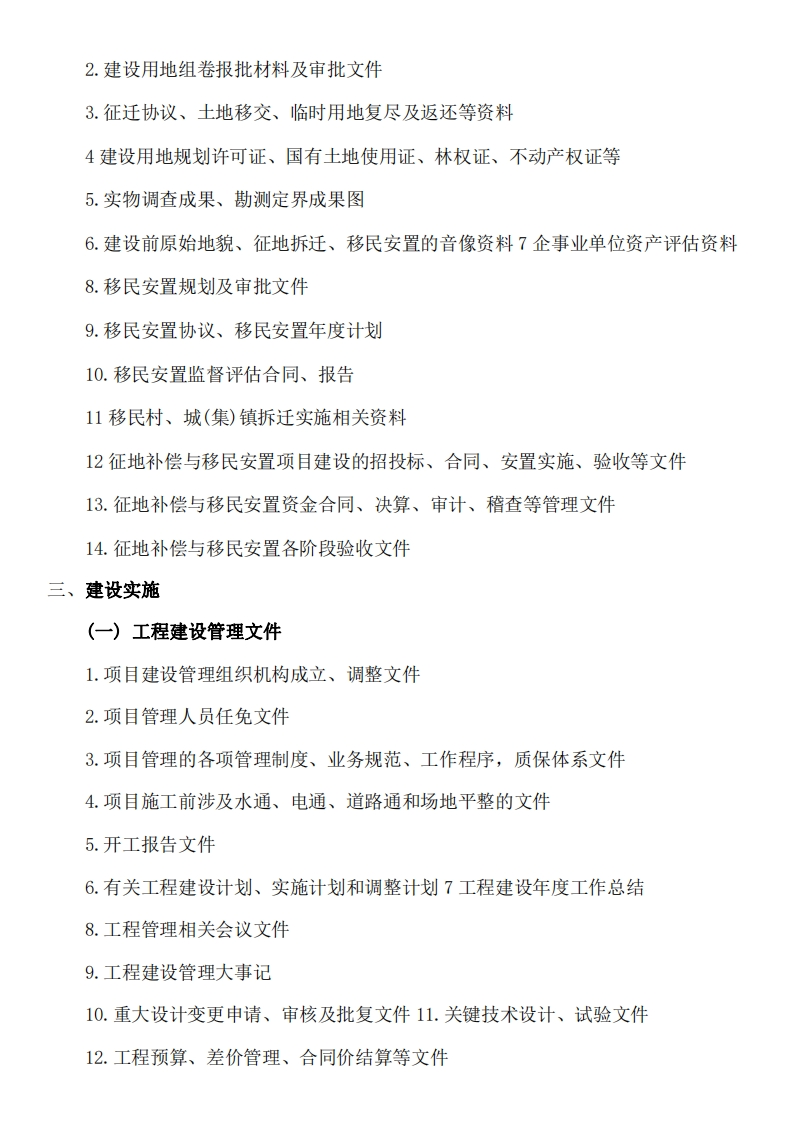 水利工程文件资料归档参考目录一、前期工作1.项目策划、筹备文件2项目建议书及审批相关文件3.项目评估、论证、咨询文件4.项目审批、核准及补充文件5.各阶段环境影响、水土保持、水资源、地震安全、文物保护、地质灾害、林地、消防等专项评估报告及批复文件6.压覆矿产资源、劳动安全与工业卫生、职业健康、防洪等专项评价文件7.停建令、社会稳定风险评估报告及批复文件8.取水(砂)、林木采伐及电网接入许可文件9.可行性研究报告及设计图纸、可研阶段审批所需各类专题报告及图件、各类报批文件、技术审查意见10地形、地貌、控制点、建筑物、构筑物及重要设备安装测量定位、观测监测记录11.气象、地震等其他设计基础资料12.规划报告书、补充报告及审批文件13.方案论证、设计及审批文件14.招标文件及主管部门审核意见15.初步设计报告及设计图纸、初设阶段审批所需各类专题报告及图件、各类报批文件、技术审查意见、概算核定意见及审批文件16.供图计划、施工图纸及各类技术文件、技术报告及审批文件二、征地补偿与移民安置1.建设用地预审材料及审查意见