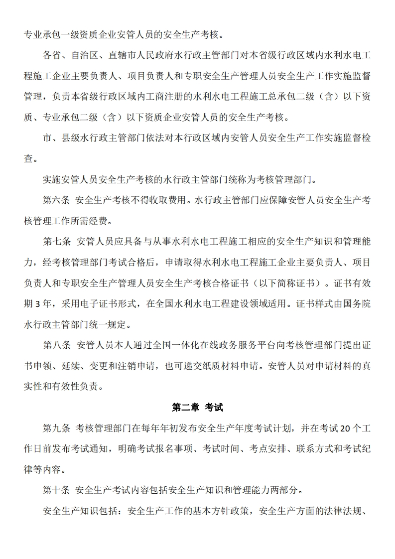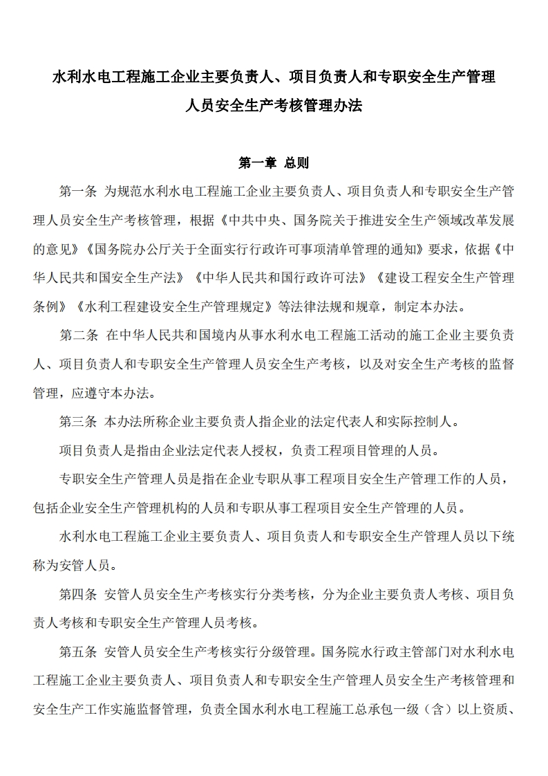 水利水电工程施工企业主要负责人、项目负责人和专职安全生产管理人员安全生产考核管理办法第一章总则第一条为规范水利水电工程施工企业主要负责人、项目负责人和专职安全生产管理人员安全生产考核管理,根据《中共中央、国务院关于推进安全生产领域改革发展的意见》《国务院办公厅关于全面实行行政许可事项清单管理的通知》要求,依据《中华人民共和国安全生产法》《中华人民共和国行政许可法》《建设工程安全生产管理条例》《水利工程建设安全生产管理规定》等法律法规和规章,制定本办法。第二条在中华人民共和国境内从事水利水电工程施工活动的施工企业主要负责人、项目负责人和专职安全生产管理人员安全生产考核,以及对安全生产考核的监督管理,应遵守本办法。第三条本办法所称企业主要负责人指企业的法定代表人和实际控制人。项目负责人是指由企业法定代表人授权,负责工程项目管理的人员。专职安全生产管理人员是指在企业专职从事工程项目安全生产管理工作的人员,包括企业安全生产管理机构的人员和专职从事工程项目安全生产管理的人员。水利水电工程施工企业主要负责人、项目负责人和专职安全生产管理人员以下统称为安管人员。第四条安管人员安全生产考核实行分类考核,分为企业主要负责人考核、项目负责人考核和专职安全生产管理人员考核。第五条安管人员安全生产考核实行分级管理。国务院水行政主管部门对水利水电工程施工企业主要负责人、项目负责人和专职安全生产管理人员安全生产考核管理和安全生产工作实施监督管理,负责全国水利水电工程施工总承包一级(含)以上资质、